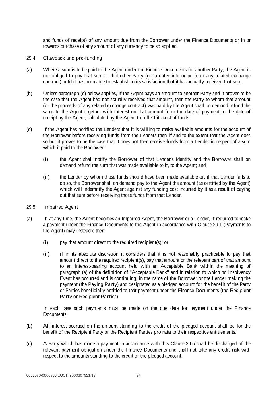 0058578-0000283 EUC1: 2000307921.12 94 and funds of receipt) of any amount due from the Borrower under the Finance Documents or in or towards purchase of any amount of any currency to be so applied. 29.4 Clawback and pre-funding (a) Where a sum is to be paid to the Agent under the Finance Documents for another Party, the Agent is not obliged to pay that sum to that other Party (or to enter into or perform any related exchange contract) until it has been able to establish to its satisfaction that it has actually received that sum. (b) Unless paragraph (c) below applies, if the Agent pays an amount to another Party and it proves to be the case that the Agent had not actually received that amount, then the Party to whom that amount (or the proceeds of any related exchange contract) was paid by the Agent shall on demand refund the same to the Agent together with interest on that amount from the date of payment to the date of receipt by the Agent, calculated by the Agent to reflect its cost of funds. (c) If the Agent has notified the Lenders that it is willing to make available amounts for the account of the Borrower before receiving funds from the Lenders then if and to the extent that the Agent does so but it proves to be the case that it does not then receive funds from a Lender in respect of a sum which it paid to the Borrower: (i) the Agent shall notify the Borrower of that Lender's identity and the Borrower shall on demand refund the sum that was made available to it, to the Agent; and (ii) the Lender by whom those funds should have been made available or, if that Lender fails to do so, the Borrower shall on demand pay to the Agent the amount (as certified by the Agent) which will indemnify the Agent against any funding cost incurred by it as a result of paying out that sum before receiving those funds from that Lender. 29.5 Impaired Agent (a) If, at any time, the Agent becomes an Impaired Agent, the Borrower or a Lender, if required to make a payment under the Finance Documents to the Agent in accordance with Clause 29.1 (Payments to the Agent) may instead either: (i) pay that amount direct to the required recipient(s); or (ii) if in its absolute discretion it considers that it is not reasonably practicable to pay that amount direct to the required recipient(s), pay that amount or the relevant part of that amount to an interest-bearing account held with an Acceptable Bank within the meaning of paragraph (a) of the definition of "Acceptable Bank" and in relation to which no Insolvency Event has occurred and is continuing, in the name of the Borrower or the Lender making the payment (the Paying Party) and designated as a pledged account for the benefit of the Party or Parties beneficially entitled to that payment under the Finance Documents (the Recipient Party or Recipient Parties). In each case such payments must be made on the due date for payment under the Finance Documents. (b) All interest accrued on the amount standing to the credit of the pledged account shall be for the benefit of the Recipient Party or the Recipient Parties pro rata to their respective entitlements. (c) A Party which has made a payment in accordance with this Clause 29.5 shall be discharged of the relevant payment obligation under the Finance Documents and shall not take any credit risk with respect to the amounts standing to the credit of the pledged account.