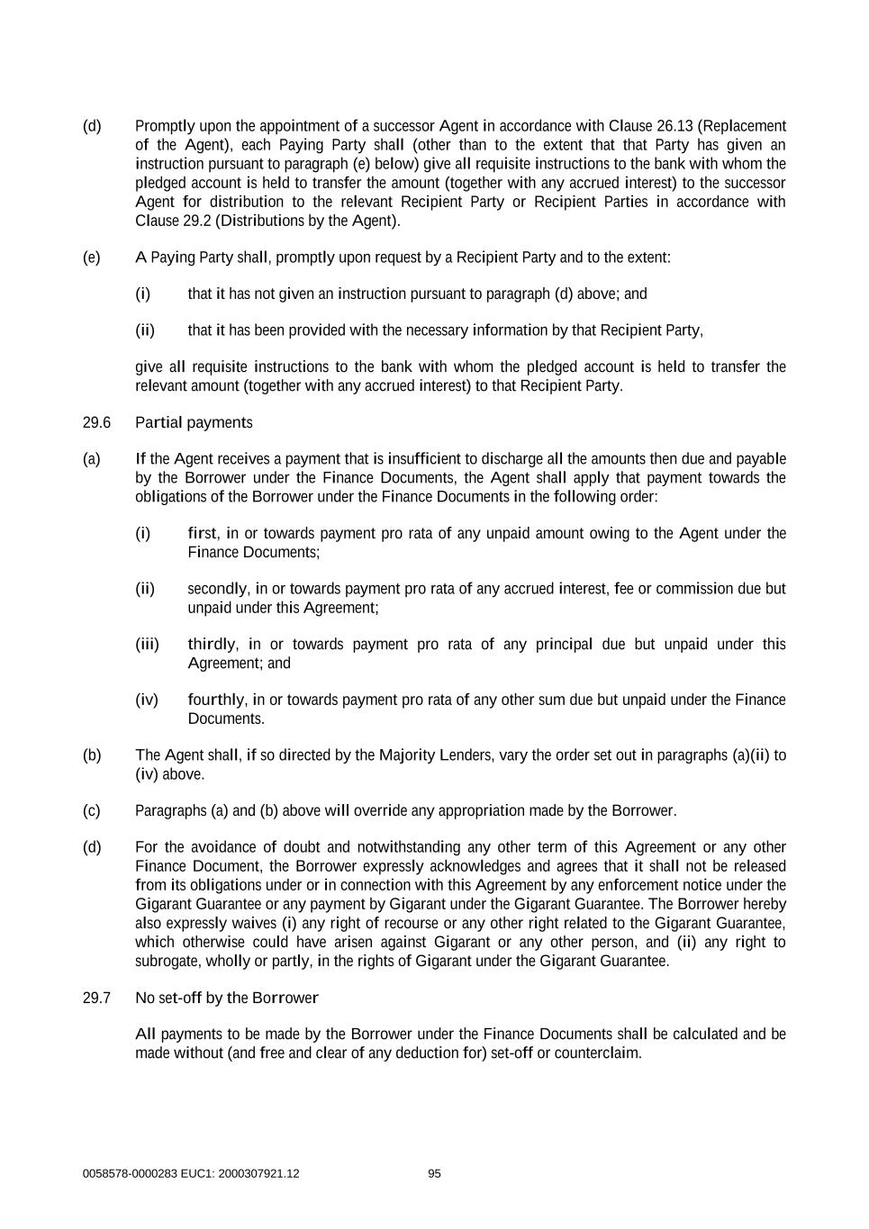 0058578-0000283 EUC1: 2000307921.12 95 (d) Promptly upon the appointment of a successor Agent in accordance with Clause 26.13 (Replacement of the Agent), each Paying Party shall (other than to the extent that that Party has given an instruction pursuant to paragraph (e) below) give all requisite instructions to the bank with whom the pledged account is held to transfer the amount (together with any accrued interest) to the successor Agent for distribution to the relevant Recipient Party or Recipient Parties in accordance with Clause 29.2 (Distributions by the Agent). (e) A Paying Party shall, promptly upon request by a Recipient Party and to the extent: (i) that it has not given an instruction pursuant to paragraph (d) above; and (ii) that it has been provided with the necessary information by that Recipient Party, give all requisite instructions to the bank with whom the pledged account is held to transfer the relevant amount (together with any accrued interest) to that Recipient Party. 29.6 Partial payments (a) If the Agent receives a payment that is insufficient to discharge all the amounts then due and payable by the Borrower under the Finance Documents, the Agent shall apply that payment towards the obligations of the Borrower under the Finance Documents in the following order: (i) first, in or towards payment pro rata of any unpaid amount owing to the Agent under the Finance Documents; (ii) secondly, in or towards payment pro rata of any accrued interest, fee or commission due but unpaid under this Agreement; (iii) thirdly, in or towards payment pro rata of any principal due but unpaid under this Agreement; and (iv) fourthly, in or towards payment pro rata of any other sum due but unpaid under the Finance Documents. (b) The Agent shall, if so directed by the Majority Lenders, vary the order set out in paragraphs (a)(ii) to (iv) above. (c) Paragraphs (a) and (b) above will override any appropriation made by the Borrower. (d) For the avoidance of doubt and notwithstanding any other term of this Agreement or any other Finance Document, the Borrower expressly acknowledges and agrees that it shall not be released from its obligations under or in connection with this Agreement by any enforcement notice under the Gigarant Guarantee or any payment by Gigarant under the Gigarant Guarantee. The Borrower hereby also expressly waives (i) any right of recourse or any other right related to the Gigarant Guarantee, which otherwise could have arisen against Gigarant or any other person, and (ii) any right to subrogate, wholly or partly, in the rights of Gigarant under the Gigarant Guarantee. 29.7 No set-off by the Borrower All payments to be made by the Borrower under the Finance Documents shall be calculated and be made without (and free and clear of any deduction for) set-off or counterclaim.