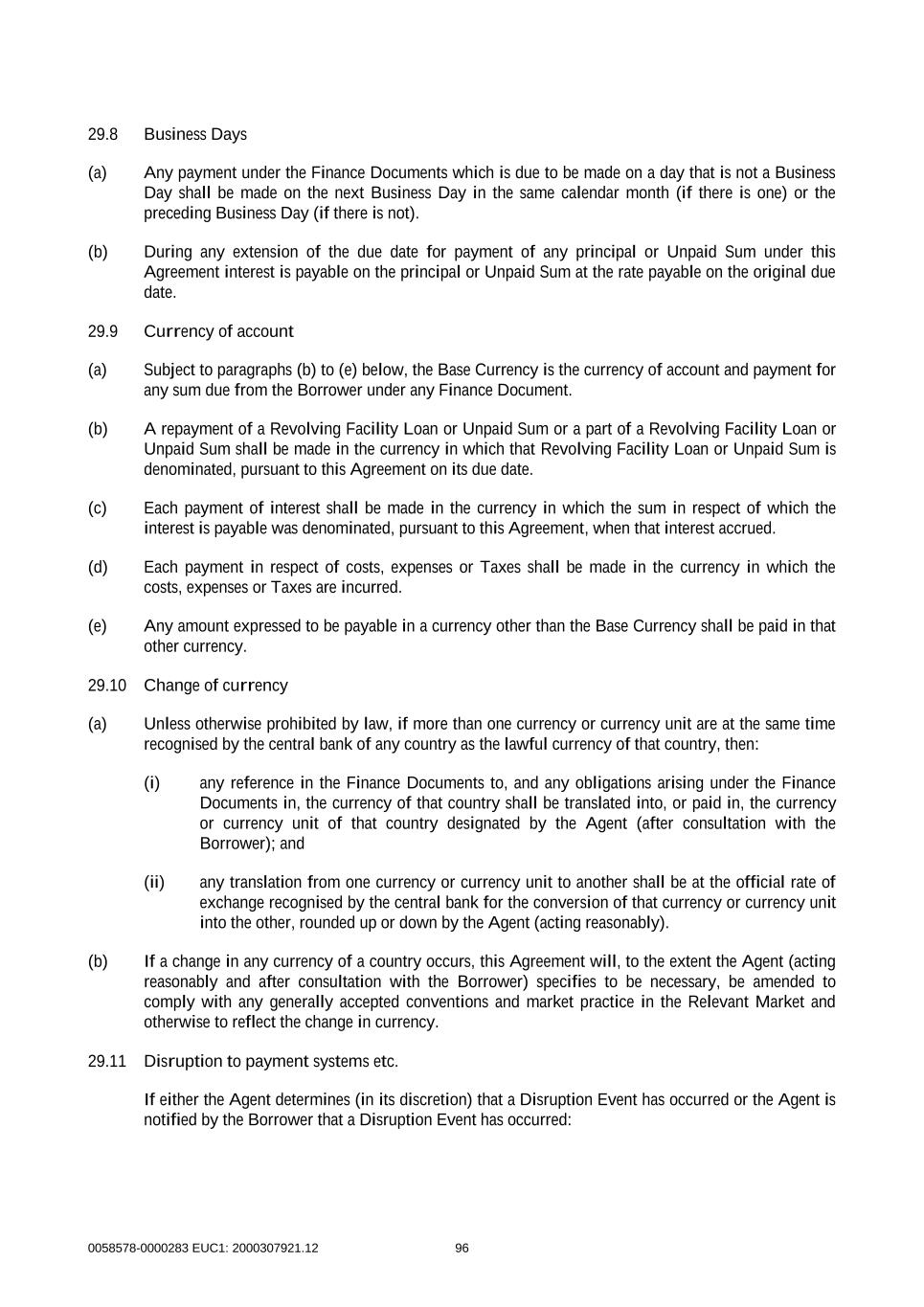 0058578-0000283 EUC1: 2000307921.12 96 29.8 Business Days (a) Any payment under the Finance Documents which is due to be made on a day that is not a Business Day shall be made on the next Business Day in the same calendar month (if there is one) or the preceding Business Day (if there is not). (b) During any extension of the due date for payment of any principal or Unpaid Sum under this Agreement interest is payable on the principal or Unpaid Sum at the rate payable on the original due date. 29.9 Currency of account (a) Subject to paragraphs (b) to (e) below, the Base Currency is the currency of account and payment for any sum due from the Borrower under any Finance Document. (b) A repayment of a Revolving Facility Loan or Unpaid Sum or a part of a Revolving Facility Loan or Unpaid Sum shall be made in the currency in which that Revolving Facility Loan or Unpaid Sum is denominated, pursuant to this Agreement on its due date. (c) Each payment of interest shall be made in the currency in which the sum in respect of which the interest is payable was denominated, pursuant to this Agreement, when that interest accrued. (d) Each payment in respect of costs, expenses or Taxes shall be made in the currency in which the costs, expenses or Taxes are incurred. (e) Any amount expressed to be payable in a currency other than the Base Currency shall be paid in that other currency. 29.10 Change of currency (a) Unless otherwise prohibited by law, if more than one currency or currency unit are at the same time recognised by the central bank of any country as the lawful currency of that country, then: (i) any reference in the Finance Documents to, and any obligations arising under the Finance Documents in, the currency of that country shall be translated into, or paid in, the currency or currency unit of that country designated by the Agent (after consultation with the Borrower); and (ii) any translation from one currency or currency unit to another shall be at the official rate of exchange recognised by the central bank for the conversion of that currency or currency unit into the other, rounded up or down by the Agent (acting reasonably). (b) If a change in any currency of a country occurs, this Agreement will, to the extent the Agent (acting reasonably and after consultation with the Borrower) specifies to be necessary, be amended to comply with any generally accepted conventions and market practice in the Relevant Market and otherwise to reflect the change in currency. 29.11 Disruption to payment systems etc. If either the Agent determines (in its discretion) that a Disruption Event has occurred or the Agent is notified by the Borrower that a Disruption Event has occurred: