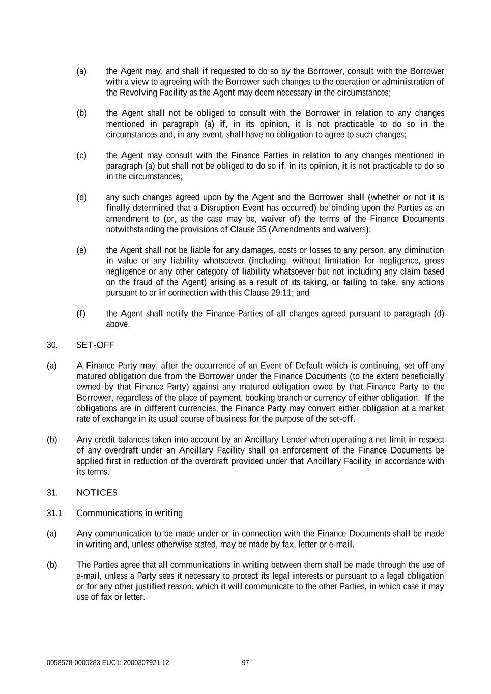 0058578-0000283 EUC1: 2000307921.12 97 (a) the Agent may, and shall if requested to do so by the Borrower, consult with the Borrower with a view to agreeing with the Borrower such changes to the operation or administration of the Revolving Facility as the Agent may deem necessary in the circumstances; (b) the Agent shall not be obliged to consult with the Borrower in relation to any changes mentioned in paragraph (a) if, in its opinion, it is not practicable to do so in the circumstances and, in any event, shall have no obligation to agree to such changes; (c) the Agent may consult with the Finance Parties in relation to any changes mentioned in paragraph (a) but shall not be obliged to do so if, in its opinion, it is not practicable to do so in the circumstances; (d) any such changes agreed upon by the Agent and the Borrower shall (whether or not it is finally determined that a Disruption Event has occurred) be binding upon the Parties as an amendment to (or, as the case may be, waiver of) the terms of the Finance Documents notwithstanding the provisions of Clause 35 (Amendments and waivers); (e) the Agent shall not be liable for any damages, costs or losses to any person, any diminution in value or any liability whatsoever (including, without limitation for negligence, gross negligence or any other category of liability whatsoever but not including any claim based on the fraud of the Agent) arising as a result of its taking, or failing to take, any actions pursuant to or in connection with this Clause 29.11; and (f) the Agent shall notify the Finance Parties of all changes agreed pursuant to paragraph (d) above. 30. SET-OFF (a) A Finance Party may, after the occurrence of an Event of Default which is continuing, set off any matured obligation due from the Borrower under the Finance Documents (to the extent beneficially owned by that Finance Party) against any matured obligation owed by that Finance Party to the Borrower, regardless of the place of payment, booking branch or currency of either obligation. If the obligations are in different currencies, the Finance Party may convert either obligation at a market rate of exchange in its usual course of business for the purpose of the set-off. (b) Any credit balances taken into account by an Ancillary Lender when operating a net limit in respect of any overdraft under an Ancillary Facility shall on enforcement of the Finance Documents be applied first in reduction of the overdraft provided under that Ancillary Facility in accordance with its terms. 31. NOTICES 31.1 Communications in writing (a) Any communication to be made under or in connection with the Finance Documents shall be made in writing and, unless otherwise stated, may be made by fax, letter or e-mail. (b) The Parties agree that all communications in writing between them shall be made through the use of e-mail, unless a Party sees it necessary to protect its legal interests or pursuant to a legal obligation or for any other justified reason, which it will communicate to the other Parties, in which case it may use of fax or letter.