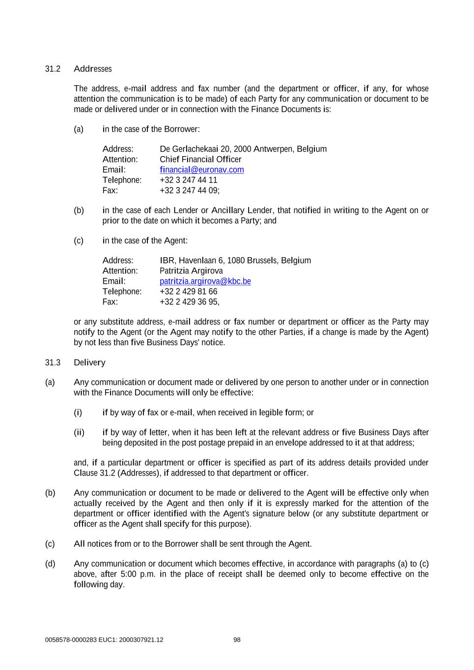 0058578-0000283 EUC1: 2000307921.12 98 31.2 Addresses The address, e-mail address and fax number (and the department or officer, if any, for whose attention the communication is to be made) of each Party for any communication or document to be made or delivered under or in connection with the Finance Documents is: (a) in the case of the Borrower: Address: De Gerlachekaai 20, 2000 Antwerpen, Belgium Attention: Chief Financial Officer Email: financial@euronav.com Telephone: +32 3 247 44 11 Fax: +32 3 247 44 09; (b) in the case of each Lender or Ancillary Lender, that notified in writing to the Agent on or prior to the date on which it becomes a Party; and (c) in the case of the Agent: Address: IBR, Havenlaan 6, 1080 Brussels, Belgium Attention: Patritzia Argirova Email: patritzia.argirova@kbc.be Telephone: +32 2 429 81 66 Fax: +32 2 429 36 95, or any substitute address, e-mail address or fax number or department or officer as the Party may notify to the Agent (or the Agent may notify to the other Parties, if a change is made by the Agent) by not less than five Business Days' notice. 31.3 Delivery (a) Any communication or document made or delivered by one person to another under or in connection with the Finance Documents will only be effective: (i) if by way of fax or e-mail, when received in legible form; or (ii) if by way of letter, when it has been left at the relevant address or five Business Days after being deposited in the post postage prepaid in an envelope addressed to it at that address; and, if a particular department or officer is specified as part of its address details provided under Clause 31.2 (Addresses), if addressed to that department or officer. (b) Any communication or document to be made or delivered to the Agent will be effective only when actually received by the Agent and then only if it is expressly marked for the attention of the department or officer identified with the Agent's signature below (or any substitute department or officer as the Agent shall specify for this purpose). (c) All notices from or to the Borrower shall be sent through the Agent. (d) Any communication or document which becomes effective, in accordance with paragraphs (a) to (c) above, after 5:00 p.m. in the place of receipt shall be deemed only to become effective on the following day.