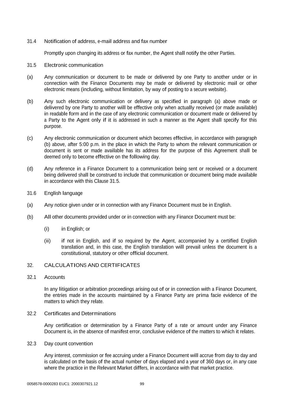 0058578-0000283 EUC1: 2000307921.12 99 31.4 Notification of address, e-mail address and fax number Promptly upon changing its address or fax number, the Agent shall notify the other Parties. 31.5 Electronic communication (a) Any communication or document to be made or delivered by one Party to another under or in connection with the Finance Documents may be made or delivered by electronic mail or other electronic means (including, without limitation, by way of posting to a secure website). (b) Any such electronic communication or delivery as specified in paragraph (a) above made or delivered by one Party to another will be effective only when actually received (or made available) in readable form and in the case of any electronic communication or document made or delivered by a Party to the Agent only if it is addressed in such a manner as the Agent shall specify for this purpose. (c) Any electronic communication or document which becomes effective, in accordance with paragraph (b) above, after 5:00 p.m. in the place in which the Party to whom the relevant communication or document is sent or made available has its address for the purpose of this Agreement shall be deemed only to become effective on the following day. (d) Any reference in a Finance Document to a communication being sent or received or a document being delivered shall be construed to include that communication or document being made available in accordance with this Clause 31.5. 31.6 English language (a) Any notice given under or in connection with any Finance Document must be in English. (b) All other documents provided under or in connection with any Finance Document must be: (i) in English; or (ii) if not in English, and if so required by the Agent, accompanied by a certified English translation and, in this case, the English translation will prevail unless the document is a constitutional, statutory or other official document. 32. CALCULATIONS AND CERTIFICATES 32.1 Accounts In any litigation or arbitration proceedings arising out of or in connection with a Finance Document, the entries made in the accounts maintained by a Finance Party are prima facie evidence of the matters to which they relate. 32.2 Certificates and Determinations Any certification or determination by a Finance Party of a rate or amount under any Finance Document is, in the absence of manifest error, conclusive evidence of the matters to which it relates. 32.3 Day count convention Any interest, commission or fee accruing under a Finance Document will accrue from day to day and is calculated on the basis of the actual number of days elapsed and a year of 360 days or, in any case where the practice in the Relevant Market differs, in accordance with that market practice.