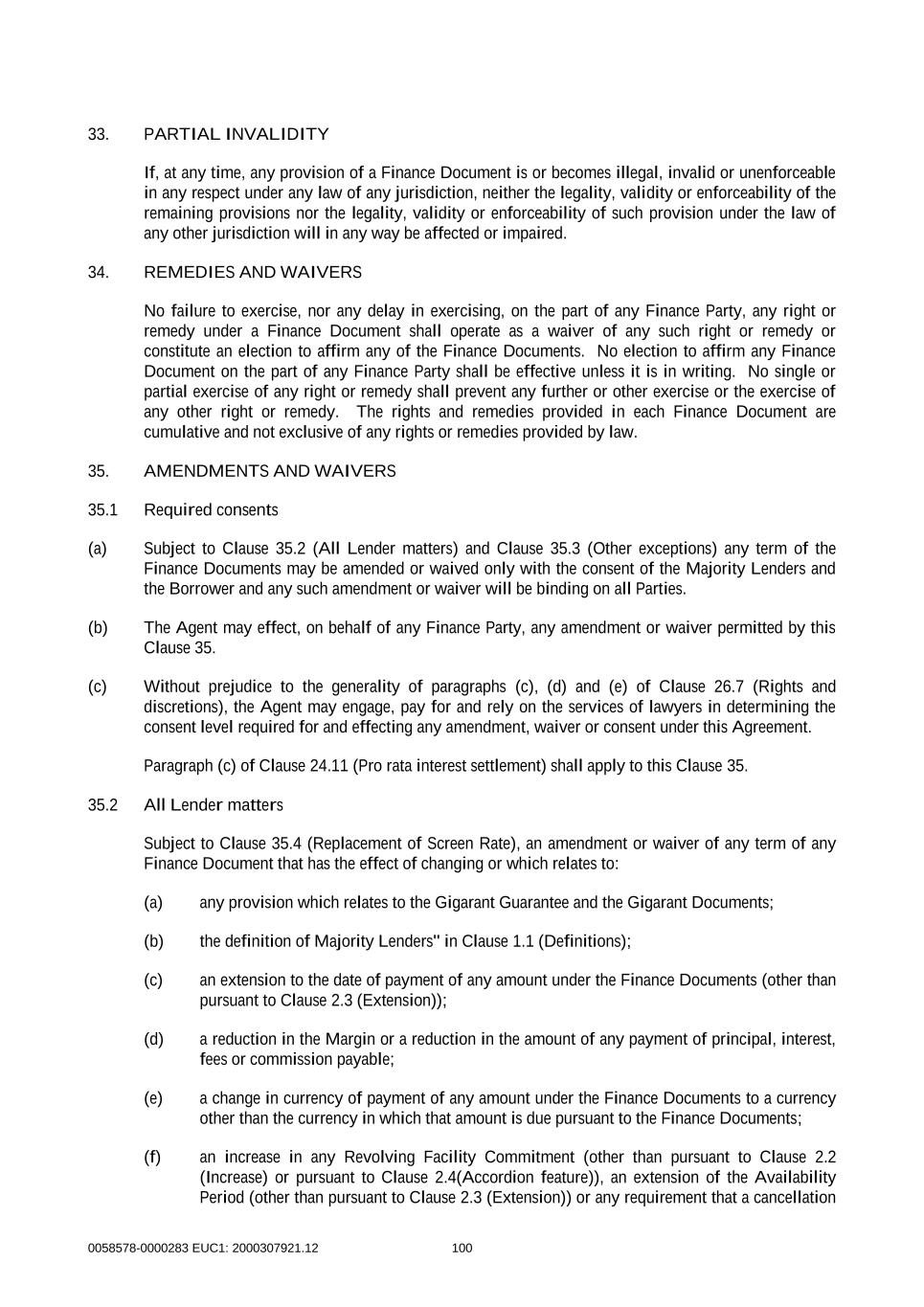 0058578-0000283 EUC1: 2000307921.12 100 33. PARTIAL INVALIDITY If, at any time, any provision of a Finance Document is or becomes illegal, invalid or unenforceable in any respect under any law of any jurisdiction, neither the legality, validity or enforceability of the remaining provisions nor the legality, validity or enforceability of such provision under the law of any other jurisdiction will in any way be affected or impaired. 34. REMEDIES AND WAIVERS No failure to exercise, nor any delay in exercising, on the part of any Finance Party, any right or remedy under a Finance Document shall operate as a waiver of any such right or remedy or constitute an election to affirm any of the Finance Documents. No election to affirm any Finance Document on the part of any Finance Party shall be effective unless it is in writing. No single or partial exercise of any right or remedy shall prevent any further or other exercise or the exercise of any other right or remedy. The rights and remedies provided in each Finance Document are cumulative and not exclusive of any rights or remedies provided by law. 35. AMENDMENTS AND WAIVERS 35.1 Required consents (a) Subject to Clause 35.2 (All Lender matters) and Clause 35.3 (Other exceptions) any term of the Finance Documents may be amended or waived only with the consent of the Majority Lenders and the Borrower and any such amendment or waiver will be binding on all Parties. (b) The Agent may effect, on behalf of any Finance Party, any amendment or waiver permitted by this Clause 35. (c) Without prejudice to the generality of paragraphs (c), (d) and (e) of Clause 26.7 (Rights and discretions), the Agent may engage, pay for and rely on the services of lawyers in determining the consent level required for and effecting any amendment, waiver or consent under this Agreement. Paragraph (c) of Clause 24.11 (Pro rata interest settlement) shall apply to this Clause 35. 35.2 All Lender matters Subject to Clause 35.4 (Replacement of Screen Rate), an amendment or waiver of any term of any Finance Document that has the effect of changing or which relates to: (a) any provision which relates to the Gigarant Guarantee and the Gigarant Documents; (b) the definition of Majority Lenders" in Clause 1.1 (Definitions); (c) an extension to the date of payment of any amount under the Finance Documents (other than pursuant to Clause 2.3 (Extension)); (d) a reduction in the Margin or a reduction in the amount of any payment of principal, interest, fees or commission payable; (e) a change in currency of payment of any amount under the Finance Documents to a currency other than the currency in which that amount is due pursuant to the Finance Documents; (f) an increase in any Revolving Facility Commitment (other than pursuant to Clause 2.2 (Increase) or pursuant to Clause 2.4(Accordion feature)), an extension of the Availability Period (other than pursuant to Clause 2.3 (Extension)) or any requirement that a cancellation