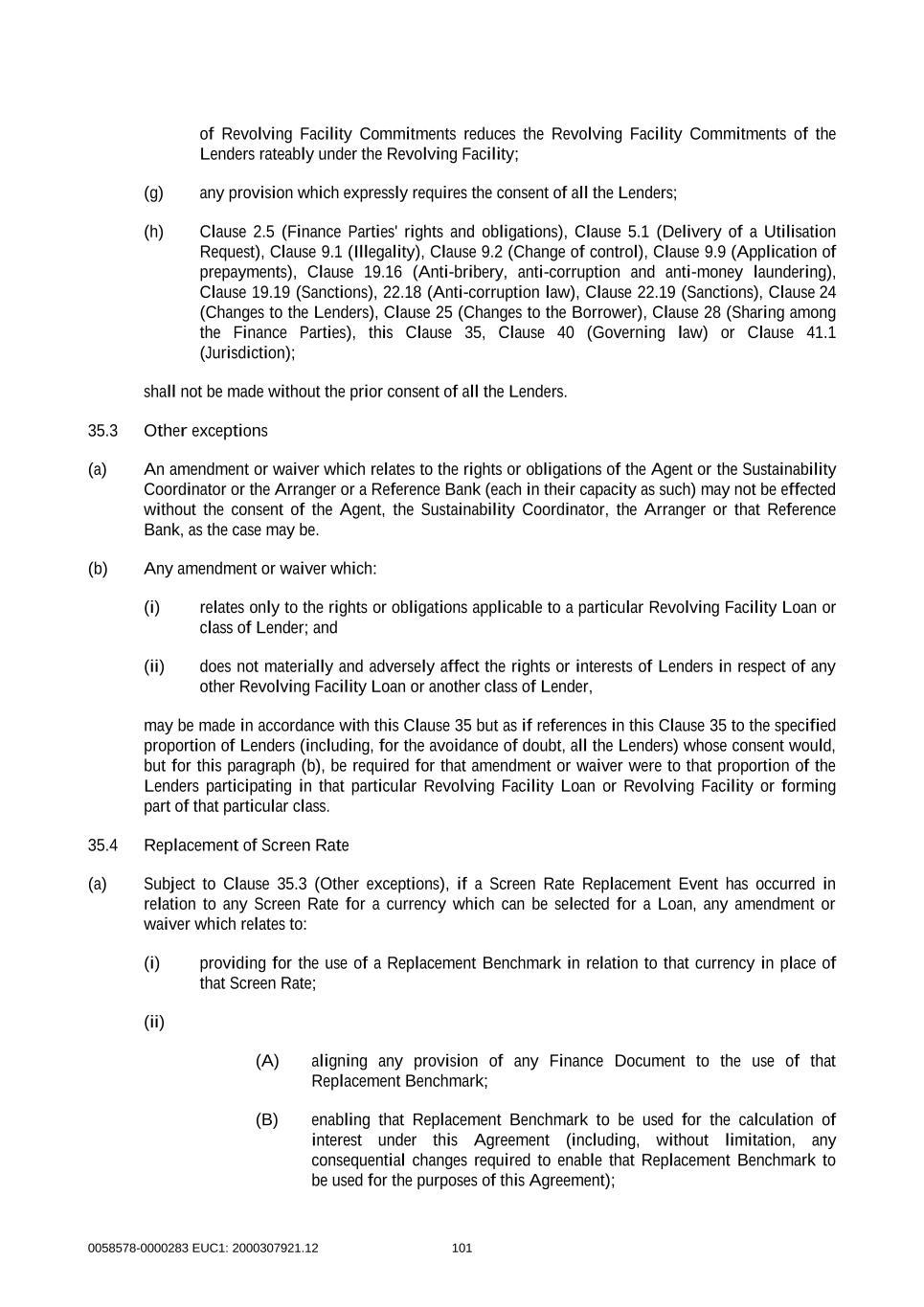 0058578-0000283 EUC1: 2000307921.12 101 of Revolving Facility Commitments reduces the Revolving Facility Commitments of the Lenders rateably under the Revolving Facility; (g) any provision which expressly requires the consent of all the Lenders; (h) Clause 2.5 (Finance Parties' rights and obligations), Clause 5.1 (Delivery of a Utilisation Request), Clause 9.1 (Illegality), Clause 9.2 (Change of control), Clause 9.9 (Application of prepayments), Clause 19.16 (Anti-bribery, anti-corruption and anti-money laundering), Clause 19.19 (Sanctions), 22.18 (Anti-corruption law), Clause 22.19 (Sanctions), Clause 24 (Changes to the Lenders), Clause 25 (Changes to the Borrower), Clause 28 (Sharing among the Finance Parties), this Clause 35, Clause 40 (Governing law) or Clause 41.1 (Jurisdiction); shall not be made without the prior consent of all the Lenders. 35.3 Other exceptions (a) An amendment or waiver which relates to the rights or obligations of the Agent or the Sustainability Coordinator or the Arranger or a Reference Bank (each in their capacity as such) may not be effected without the consent of the Agent, the Sustainability Coordinator, the Arranger or that Reference Bank, as the case may be. (b) Any amendment or waiver which: (i) relates only to the rights or obligations applicable to a particular Revolving Facility Loan or class of Lender; and (ii) does not materially and adversely affect the rights or interests of Lenders in respect of any other Revolving Facility Loan or another class of Lender, may be made in accordance with this Clause 35 but as if references in this Clause 35 to the specified proportion of Lenders (including, for the avoidance of doubt, all the Lenders) whose consent would, but for this paragraph (b), be required for that amendment or waiver were to that proportion of the Lenders participating in that particular Revolving Facility Loan or Revolving Facility or forming part of that particular class. 35.4 Replacement of Screen Rate (a) Subject to Clause 35.3 (Other exceptions), if a Screen Rate Replacement Event has occurred in relation to any Screen Rate for a currency which can be selected for a Loan, any amendment or waiver which relates to: (i) providing for the use of a Replacement Benchmark in relation to that currency in place of that Screen Rate; (ii) (A) aligning any provision of any Finance Document to the use of that Replacement Benchmark; (B) enabling that Replacement Benchmark to be used for the calculation of interest under this Agreement (including, without limitation, any consequential changes required to enable that Replacement Benchmark to be used for the purposes of this Agreement);