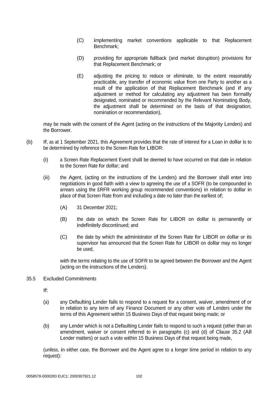 0058578-0000283 EUC1: 2000307921.12 102 (C) implementing market conventions applicable to that Replacement Benchmark; (D) providing for appropriate fallback (and market disruption) provisions for that Replacement Benchmark; or (E) adjusting the pricing to reduce or eliminate, to the extent reasonably practicable, any transfer of economic value from one Party to another as a result of the application of that Replacement Benchmark (and if any adjustment or method for calculating any adjustment has been formally designated, nominated or recommended by the Relevant Nominating Body, the adjustment shall be determined on the basis of that designation, nomination or recommendation), may be made with the consent of the Agent (acting on the instructions of the Majority Lenders) and the Borrower. (b) If, as at 1 September 2021, this Agreement provides that the rate of interest for a Loan in dollar is to be determined by reference to the Screen Rate for LIBOR: (i) a Screen Rate Replacement Event shall be deemed to have occurred on that date in relation to the Screen Rate for dollar; and (ii) the Agent, (acting on the instructions of the Lenders) and the Borrower shall enter into negotiations in good faith with a view to agreeing the use of a SOFR (to be compounded in arrears using the £RFR working group recommended conventions) in relation to dollar in place of that Screen Rate from and including a date no later than the earliest of; (A) 31 December 2021; (B) the date on which the Screen Rate for LIBOR on dollar is permanently or indefinitely discontinued; and (C) the date by which the administrator of the Screen Rate for LIBOR on dollar or its supervisor has announced that the Screen Rate for LIBOR on dollar may no longer be used, with the terms relating to the use of SOFR to be agreed between the Borrower and the Agent (acting on the instructions of the Lenders). 35.5 Excluded Commitments If: (a) any Defaulting Lender fails to respond to a request for a consent, waiver, amendment of or in relation to any term of any Finance Document or any other vote of Lenders under the terms of this Agreement within 15 Business Days of that request being made; or (b) any Lender which is not a Defaulting Lender fails to respond to such a request (other than an amendment, waiver or consent referred to in paragraphs (c) and (d) of Clause 35.2 (All Lender matters) or such a vote within 15 Business Days of that request being made, (unless, in either case, the Borrower and the Agent agree to a longer time period in relation to any request):