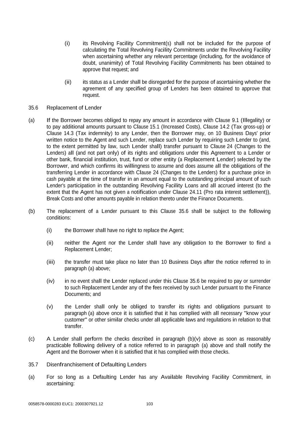 0058578-0000283 EUC1: 2000307921.12 103 (i) its Revolving Facility Commitment(s) shall not be included for the purpose of calculating the Total Revolving Facility Commitments under the Revolving Facility when ascertaining whether any relevant percentage (including, for the avoidance of doubt, unanimity) of Total Revolving Facility Commitments has been obtained to approve that request; and (ii) its status as a Lender shall be disregarded for the purpose of ascertaining whether the agreement of any specified group of Lenders has been obtained to approve that request. 35.6 Replacement of Lender (a) If the Borrower becomes obliged to repay any amount in accordance with Clause 9.1 (Illegality) or to pay additional amounts pursuant to Clause 15.1 (Increased Costs), Clause 14.2 (Tax gross-up) or Clause 14.3 (Tax indemnity) to any Lender, then the Borrower may, on 10 Business Days' prior written notice to the Agent and such Lender, replace such Lender by requiring such Lender to (and, to the extent permitted by law, such Lender shall) transfer pursuant to Clause 24 (Changes to the Lenders) all (and not part only) of its rights and obligations under this Agreement to a Lender or other bank, financial institution, trust, fund or other entity (a Replacement Lender) selected by the Borrower, and which confirms its willingness to assume and does assume all the obligations of the transferring Lender in accordance with Clause 24 (Changes to the Lenders) for a purchase price in cash payable at the time of transfer in an amount equal to the outstanding principal amount of such Lender's participation in the outstanding Revolving Facility Loans and all accrued interest (to the extent that the Agent has not given a notification under Clause 24.11 (Pro rata interest settlement)), Break Costs and other amounts payable in relation thereto under the Finance Documents. (b) The replacement of a Lender pursuant to this Clause 35.6 shall be subject to the following conditions: (i) the Borrower shall have no right to replace the Agent; (ii) neither the Agent nor the Lender shall have any obligation to the Borrower to find a Replacement Lender; (iii) the transfer must take place no later than 10 Business Days after the notice referred to in paragraph (a) above; (iv) in no event shall the Lender replaced under this Clause 35.6 be required to pay or surrender to such Replacement Lender any of the fees received by such Lender pursuant to the Finance Documents; and (v) the Lender shall only be obliged to transfer its rights and obligations pursuant to paragraph (a) above once it is satisfied that it has complied with all necessary "know your customer" or other similar checks under all applicable laws and regulations in relation to that transfer. (c) A Lender shall perform the checks described in paragraph (b)(v) above as soon as reasonably practicable following delivery of a notice referred to in paragraph (a) above and shall notify the Agent and the Borrower when it is satisfied that it has complied with those checks. 35.7 Disenfranchisement of Defaulting Lenders (a) For so long as a Defaulting Lender has any Available Revolving Facility Commitment, in ascertaining: