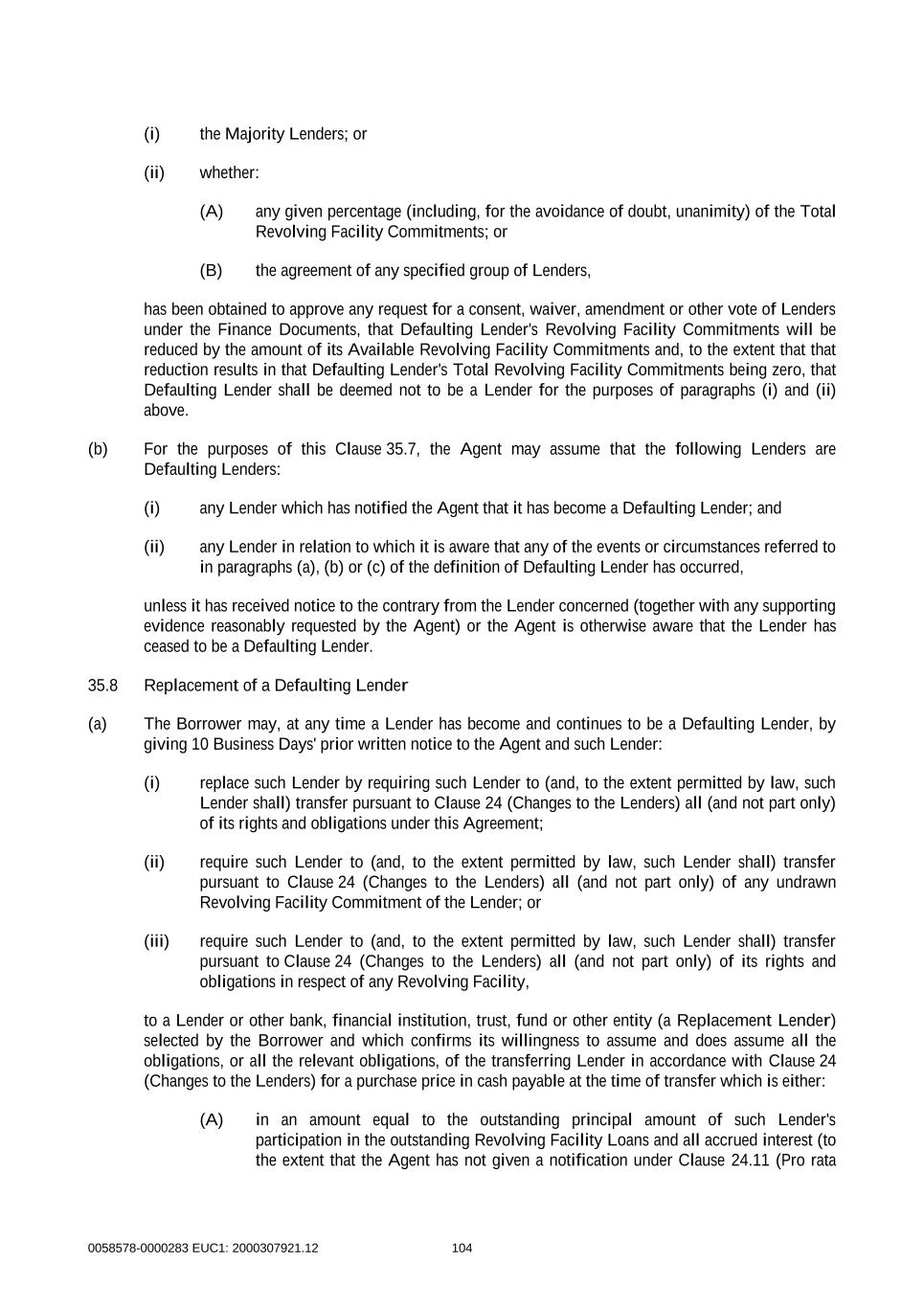0058578-0000283 EUC1: 2000307921.12 104 (i) the Majority Lenders; or (ii) whether: (A) any given percentage (including, for the avoidance of doubt, unanimity) of the Total Revolving Facility Commitments; or (B) the agreement of any specified group of Lenders, has been obtained to approve any request for a consent, waiver, amendment or other vote of Lenders under the Finance Documents, that Defaulting Lender's Revolving Facility Commitments will be reduced by the amount of its Available Revolving Facility Commitments and, to the extent that that reduction results in that Defaulting Lender's Total Revolving Facility Commitments being zero, that Defaulting Lender shall be deemed not to be a Lender for the purposes of paragraphs (i) and (ii) above. (b) For the purposes of this Clause 35.7, the Agent may assume that the following Lenders are Defaulting Lenders: (i) any Lender which has notified the Agent that it has become a Defaulting Lender; and (ii) any Lender in relation to which it is aware that any of the events or circumstances referred to in paragraphs (a), (b) or (c) of the definition of Defaulting Lender has occurred, unless it has received notice to the contrary from the Lender concerned (together with any supporting evidence reasonably requested by the Agent) or the Agent is otherwise aware that the Lender has ceased to be a Defaulting Lender. 35.8 Replacement of a Defaulting Lender (a) The Borrower may, at any time a Lender has become and continues to be a Defaulting Lender, by giving 10 Business Days' prior written notice to the Agent and such Lender: (i) replace such Lender by requiring such Lender to (and, to the extent permitted by law, such Lender shall) transfer pursuant to Clause 24 (Changes to the Lenders) all (and not part only) of its rights and obligations under this Agreement; (ii) require such Lender to (and, to the extent permitted by law, such Lender shall) transfer pursuant to Clause 24 (Changes to the Lenders) all (and not part only) of any undrawn Revolving Facility Commitment of the Lender; or (iii) require such Lender to (and, to the extent permitted by law, such Lender shall) transfer pursuant to Clause 24 (Changes to the Lenders) all (and not part only) of its rights and obligations in respect of any Revolving Facility, to a Lender or other bank, financial institution, trust, fund or other entity (a Replacement Lender) selected by the Borrower and which confirms its willingness to assume and does assume all the obligations, or all the relevant obligations, of the transferring Lender in accordance with Clause 24 (Changes to the Lenders) for a purchase price in cash payable at the time of transfer which is either: (A) in an amount equal to the outstanding principal amount of such Lender's participation in the outstanding Revolving Facility Loans and all accrued interest (to the extent that the Agent has not given a notification under Clause 24.11 (Pro rata