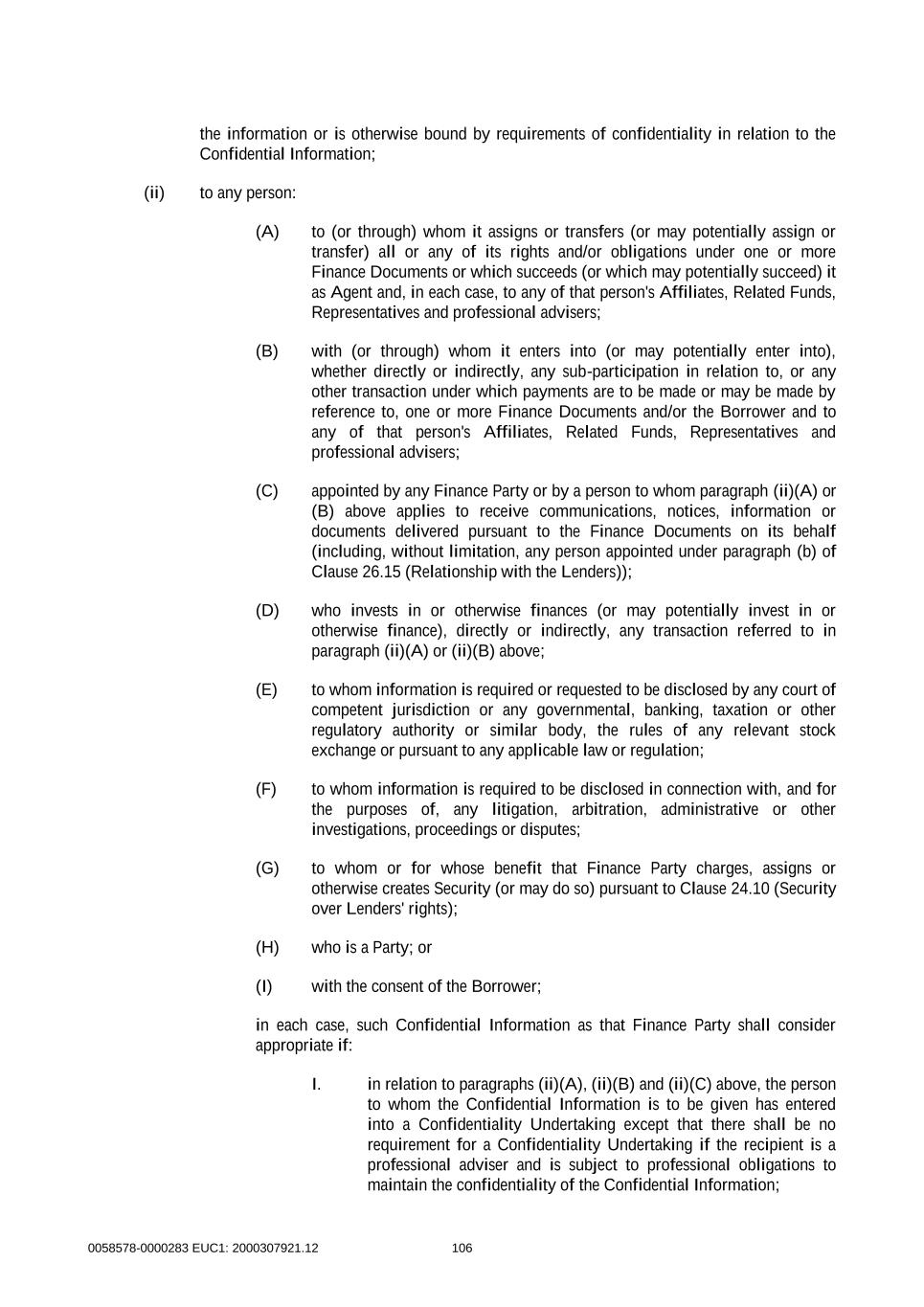 0058578-0000283 EUC1: 2000307921.12 106 the information or is otherwise bound by requirements of confidentiality in relation to the Confidential Information; (ii) to any person: (A) to (or through) whom it assigns or transfers (or may potentially assign or transfer) all or any of its rights and/or obligations under one or more Finance Documents or which succeeds (or which may potentially succeed) it as Agent and, in each case, to any of that person's Affiliates, Related Funds, Representatives and professional advisers; (B) with (or through) whom it enters into (or may potentially enter into), whether directly or indirectly, any sub-participation in relation to, or any other transaction under which payments are to be made or may be made by reference to, one or more Finance Documents and/or the Borrower and to any of that person's Affiliates, Related Funds, Representatives and professional advisers; (C) appointed by any Finance Party or by a person to whom paragraph (ii)(A) or (B) above applies to receive communications, notices, information or documents delivered pursuant to the Finance Documents on its behalf (including, without limitation, any person appointed under paragraph (b) of Clause 26.15 (Relationship with the Lenders)); (D) who invests in or otherwise finances (or may potentially invest in or otherwise finance), directly or indirectly, any transaction referred to in paragraph (ii)(A) or (ii)(B) above; (E) to whom information is required or requested to be disclosed by any court of competent jurisdiction or any governmental, banking, taxation or other regulatory authority or similar body, the rules of any relevant stock exchange or pursuant to any applicable law or regulation; (F) to whom information is required to be disclosed in connection with, and for the purposes of, any litigation, arbitration, administrative or other investigations, proceedings or disputes; (G) to whom or for whose benefit that Finance Party charges, assigns or otherwise creates Security (or may do so) pursuant to Clause 24.10 (Security over Lenders' rights); (H) who is a Party; or (I) with the consent of the Borrower; in each case, such Confidential Information as that Finance Party shall consider appropriate if: I. in relation to paragraphs (ii)(A), (ii)(B) and (ii)(C) above, the person to whom the Confidential Information is to be given has entered into a Confidentiality Undertaking except that there shall be no requirement for a Confidentiality Undertaking if the recipient is a professional adviser and is subject to professional obligations to maintain the confidentiality of the Confidential Information;