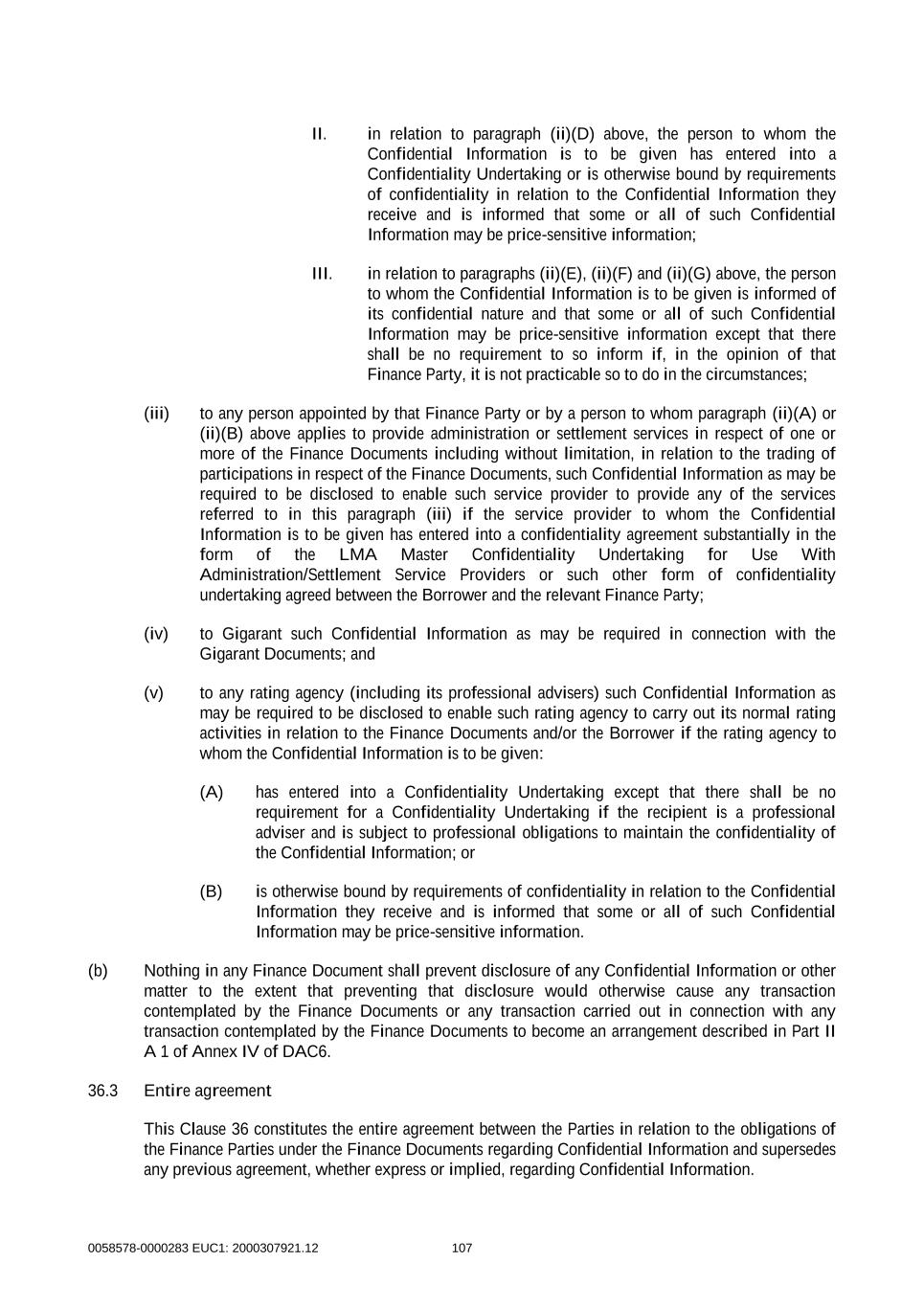 0058578-0000283 EUC1: 2000307921.12 107 II. in relation to paragraph (ii)(D) above, the person to whom the Confidential Information is to be given has entered into a Confidentiality Undertaking or is otherwise bound by requirements of confidentiality in relation to the Confidential Information they receive and is informed that some or all of such Confidential Information may be price-sensitive information; III. in relation to paragraphs (ii)(E), (ii)(F) and (ii)(G) above, the person to whom the Confidential Information is to be given is informed of its confidential nature and that some or all of such Confidential Information may be price-sensitive information except that there shall be no requirement to so inform if, in the opinion of that Finance Party, it is not practicable so to do in the circumstances; (iii) to any person appointed by that Finance Party or by a person to whom paragraph (ii)(A) or (ii)(B) above applies to provide administration or settlement services in respect of one or more of the Finance Documents including without limitation, in relation to the trading of participations in respect of the Finance Documents, such Confidential Information as may be required to be disclosed to enable such service provider to provide any of the services referred to in this paragraph (iii) if the service provider to whom the Confidential Information is to be given has entered into a confidentiality agreement substantially in the form of the LMA Master Confidentiality Undertaking for Use With Administration/Settlement Service Providers or such other form of confidentiality undertaking agreed between the Borrower and the relevant Finance Party; (iv) to Gigarant such Confidential Information as may be required in connection with the Gigarant Documents; and (v) to any rating agency (including its professional advisers) such Confidential Information as may be required to be disclosed to enable such rating agency to carry out its normal rating activities in relation to the Finance Documents and/or the Borrower if the rating agency to whom the Confidential Information is to be given: (A) has entered into a Confidentiality Undertaking except that there shall be no requirement for a Confidentiality Undertaking if the recipient is a professional adviser and is subject to professional obligations to maintain the confidentiality of the Confidential Information; or (B) is otherwise bound by requirements of confidentiality in relation to the Confidential Information they receive and is informed that some or all of such Confidential Information may be price-sensitive information. (b) Nothing in any Finance Document shall prevent disclosure of any Confidential Information or other matter to the extent that preventing that disclosure would otherwise cause any transaction contemplated by the Finance Documents or any transaction carried out in connection with any transaction contemplated by the Finance Documents to become an arrangement described in Part II A 1 of Annex IV of DAC6. 36.3 Entire agreement This Clause 36 constitutes the entire agreement between the Parties in relation to the obligations of the Finance Parties under the Finance Documents regarding Confidential Information and supersedes any previous agreement, whether express or implied, regarding Confidential Information.