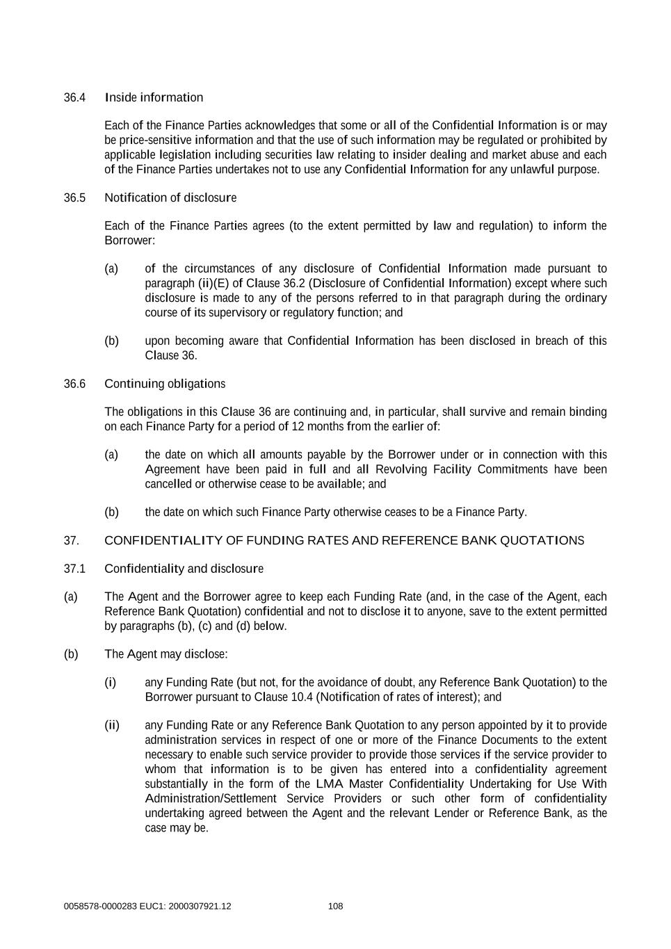 0058578-0000283 EUC1: 2000307921.12 108 36.4 Inside information Each of the Finance Parties acknowledges that some or all of the Confidential Information is or may be price-sensitive information and that the use of such information may be regulated or prohibited by applicable legislation including securities law relating to insider dealing and market abuse and each of the Finance Parties undertakes not to use any Confidential Information for any unlawful purpose. 36.5 Notification of disclosure Each of the Finance Parties agrees (to the extent permitted by law and regulation) to inform the Borrower: (a) of the circumstances of any disclosure of Confidential Information made pursuant to paragraph (ii)(E) of Clause 36.2 (Disclosure of Confidential Information) except where such disclosure is made to any of the persons referred to in that paragraph during the ordinary course of its supervisory or regulatory function; and (b) upon becoming aware that Confidential Information has been disclosed in breach of this Clause 36. 36.6 Continuing obligations The obligations in this Clause 36 are continuing and, in particular, shall survive and remain binding on each Finance Party for a period of 12 months from the earlier of: (a) the date on which all amounts payable by the Borrower under or in connection with this Agreement have been paid in full and all Revolving Facility Commitments have been cancelled or otherwise cease to be available; and (b) the date on which such Finance Party otherwise ceases to be a Finance Party. 37. CONFIDENTIALITY OF FUNDING RATES AND REFERENCE BANK QUOTATIONS 37.1 Confidentiality and disclosure (a) The Agent and the Borrower agree to keep each Funding Rate (and, in the case of the Agent, each Reference Bank Quotation) confidential and not to disclose it to anyone, save to the extent permitted by paragraphs (b), (c) and (d) below. (b) The Agent may disclose: (i) any Funding Rate (but not, for the avoidance of doubt, any Reference Bank Quotation) to the Borrower pursuant to Clause 10.4 (Notification of rates of interest); and (ii) any Funding Rate or any Reference Bank Quotation to any person appointed by it to provide administration services in respect of one or more of the Finance Documents to the extent necessary to enable such service provider to provide those services if the service provider to whom that information is to be given has entered into a confidentiality agreement substantially in the form of the LMA Master Confidentiality Undertaking for Use With Administration/Settlement Service Providers or such other form of confidentiality undertaking agreed between the Agent and the relevant Lender or Reference Bank, as the case may be.