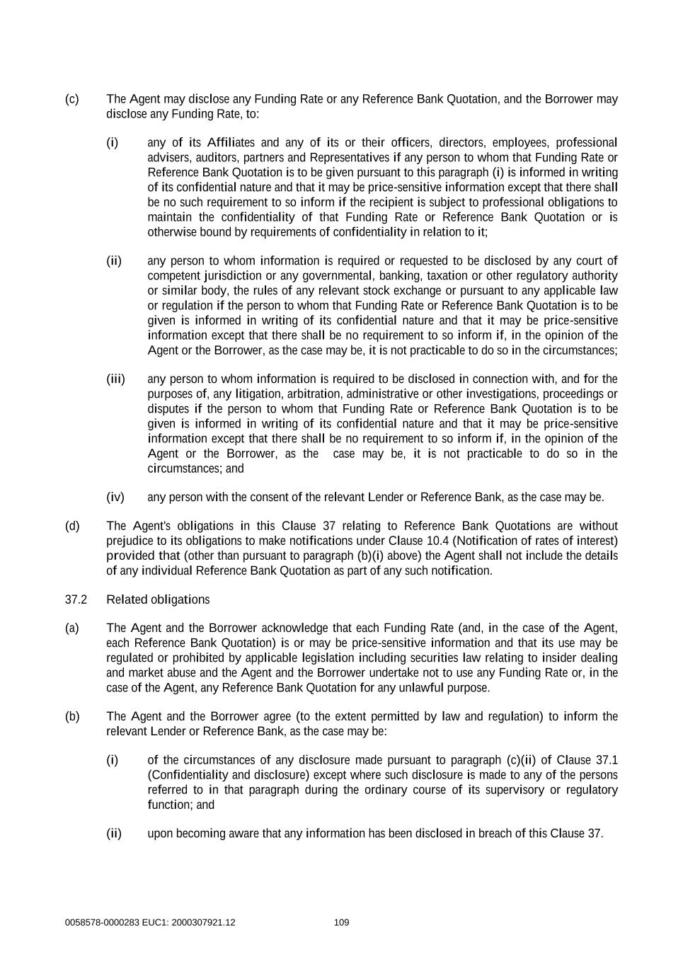 0058578-0000283 EUC1: 2000307921.12 109 (c) The Agent may disclose any Funding Rate or any Reference Bank Quotation, and the Borrower may disclose any Funding Rate, to: (i) any of its Affiliates and any of its or their officers, directors, employees, professional advisers, auditors, partners and Representatives if any person to whom that Funding Rate or Reference Bank Quotation is to be given pursuant to this paragraph (i) is informed in writing of its confidential nature and that it may be price-sensitive information except that there shall be no such requirement to so inform if the recipient is subject to professional obligations to maintain the confidentiality of that Funding Rate or Reference Bank Quotation or is otherwise bound by requirements of confidentiality in relation to it; (ii) any person to whom information is required or requested to be disclosed by any court of competent jurisdiction or any governmental, banking, taxation or other regulatory authority or similar body, the rules of any relevant stock exchange or pursuant to any applicable law or regulation if the person to whom that Funding Rate or Reference Bank Quotation is to be given is informed in writing of its confidential nature and that it may be price-sensitive information except that there shall be no requirement to so inform if, in the opinion of the Agent or the Borrower, as the case may be, it is not practicable to do so in the circumstances; (iii) any person to whom information is required to be disclosed in connection with, and for the purposes of, any litigation, arbitration, administrative or other investigations, proceedings or disputes if the person to whom that Funding Rate or Reference Bank Quotation is to be given is informed in writing of its confidential nature and that it may be price-sensitive information except that there shall be no requirement to so inform if, in the opinion of the Agent or the Borrower, as the case may be, it is not practicable to do so in the circumstances; and (iv) any person with the consent of the relevant Lender or Reference Bank, as the case may be. (d) The Agent's obligations in this Clause 37 relating to Reference Bank Quotations are without prejudice to its obligations to make notifications under Clause 10.4 (Notification of rates of interest) provided that (other than pursuant to paragraph (b)(i) above) the Agent shall not include the details of any individual Reference Bank Quotation as part of any such notification. 37.2 Related obligations (a) The Agent and the Borrower acknowledge that each Funding Rate (and, in the case of the Agent, each Reference Bank Quotation) is or may be price-sensitive information and that its use may be regulated or prohibited by applicable legislation including securities law relating to insider dealing and market abuse and the Agent and the Borrower undertake not to use any Funding Rate or, in the case of the Agent, any Reference Bank Quotation for any unlawful purpose. (b) The Agent and the Borrower agree (to the extent permitted by law and regulation) to inform the relevant Lender or Reference Bank, as the case may be: (i) of the circumstances of any disclosure made pursuant to paragraph (c)(ii) of Clause 37.1 (Confidentiality and disclosure) except where such disclosure is made to any of the persons referred to in that paragraph during the ordinary course of its supervisory or regulatory function; and (ii) upon becoming aware that any information has been disclosed in breach of this Clause 37.