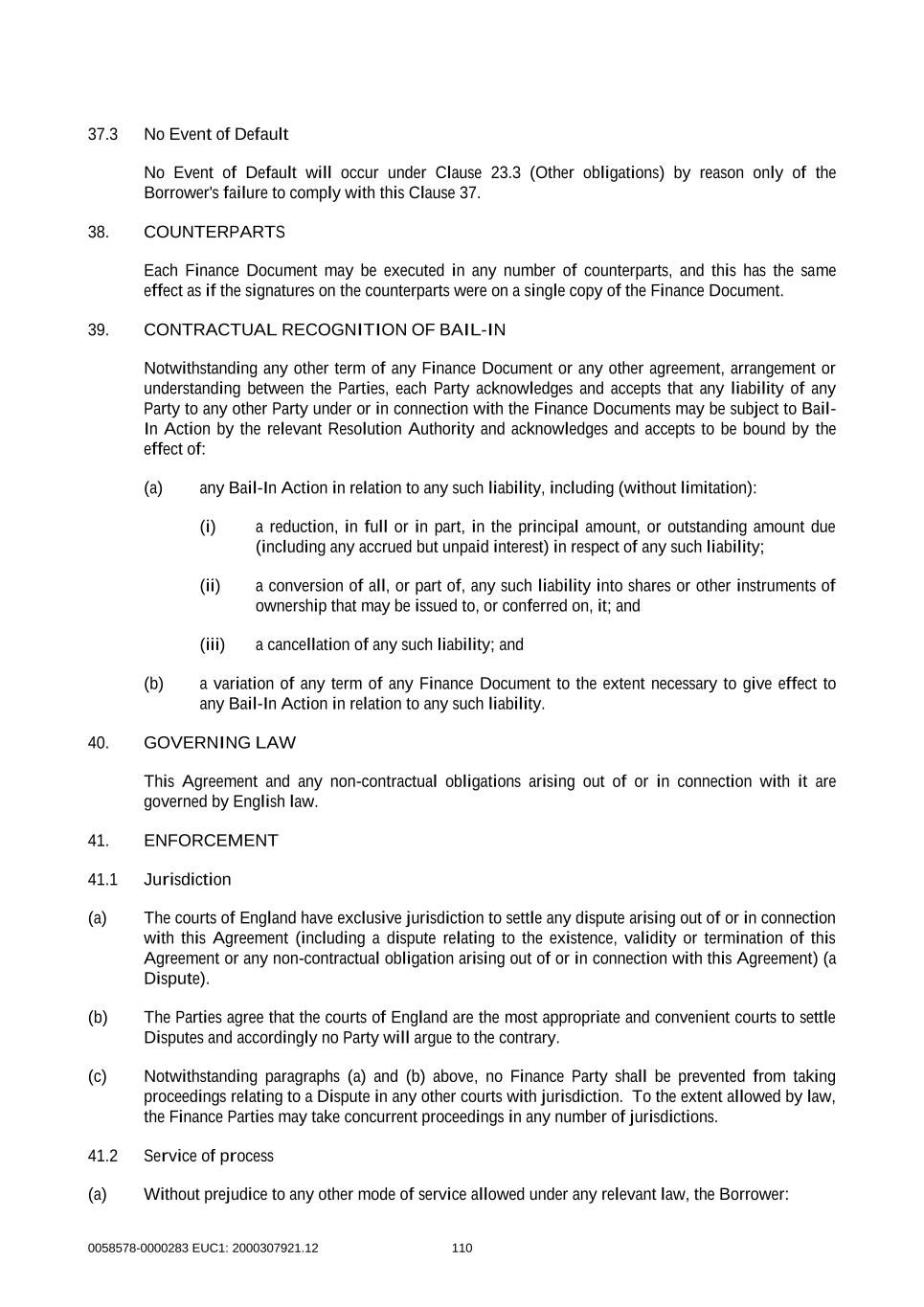 0058578-0000283 EUC1: 2000307921.12 110 37.3 No Event of Default No Event of Default will occur under Clause 23.3 (Other obligations) by reason only of the Borrower's failure to comply with this Clause 37. 38. COUNTERPARTS Each Finance Document may be executed in any number of counterparts, and this has the same effect as if the signatures on the counterparts were on a single copy of the Finance Document. 39. CONTRACTUAL RECOGNITION OF BAIL-IN Notwithstanding any other term of any Finance Document or any other agreement, arrangement or understanding between the Parties, each Party acknowledges and accepts that any liability of any Party to any other Party under or in connection with the Finance Documents may be subject to Bail- In Action by the relevant Resolution Authority and acknowledges and accepts to be bound by the effect of: (a) any Bail-In Action in relation to any such liability, including (without limitation): (i) a reduction, in full or in part, in the principal amount, or outstanding amount due (including any accrued but unpaid interest) in respect of any such liability; (ii) a conversion of all, or part of, any such liability into shares or other instruments of ownership that may be issued to, or conferred on, it; and (iii) a cancellation of any such liability; and (b) a variation of any term of any Finance Document to the extent necessary to give effect to any Bail-In Action in relation to any such liability. 40. GOVERNING LAW This Agreement and any non-contractual obligations arising out of or in connection with it are governed by English law. 41. ENFORCEMENT 41.1 Jurisdiction (a) The courts of England have exclusive jurisdiction to settle any dispute arising out of or in connection with this Agreement (including a dispute relating to the existence, validity or termination of this Agreement or any non-contractual obligation arising out of or in connection with this Agreement) (a Dispute). (b) The Parties agree that the courts of England are the most appropriate and convenient courts to settle Disputes and accordingly no Party will argue to the contrary. (c) Notwithstanding paragraphs (a) and (b) above, no Finance Party shall be prevented from taking proceedings relating to a Dispute in any other courts with jurisdiction. To the extent allowed by law, the Finance Parties may take concurrent proceedings in any number of jurisdictions. 41.2 Service of process (a) Without prejudice to any other mode of service allowed under any relevant law, the Borrower: