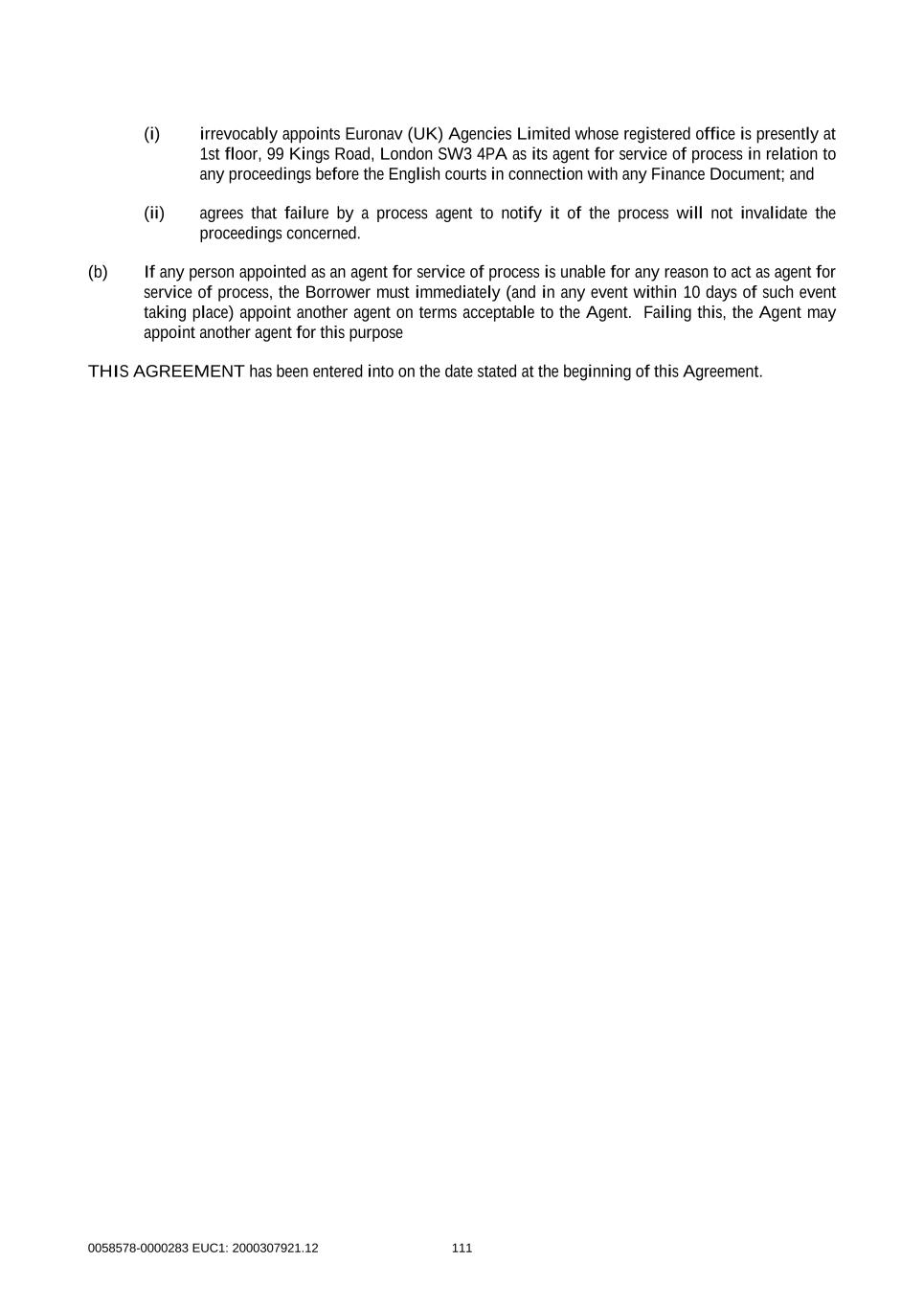 0058578-0000283 EUC1: 2000307921.12 111 (i) irrevocably appoints Euronav (UK) Agencies Limited whose registered office is presently at 1st floor, 99 Kings Road, London SW3 4PA as its agent for service of process in relation to any proceedings before the English courts in connection with any Finance Document; and (ii) agrees that failure by a process agent to notify it of the process will not invalidate the proceedings concerned. (b) If any person appointed as an agent for service of process is unable for any reason to act as agent for service of process, the Borrower must immediately (and in any event within 10 days of such event taking place) appoint another agent on terms acceptable to the Agent. Failing this, the Agent may appoint another agent for this purpose THIS AGREEMENT has been entered into on the date stated at the beginning of this Agreement.