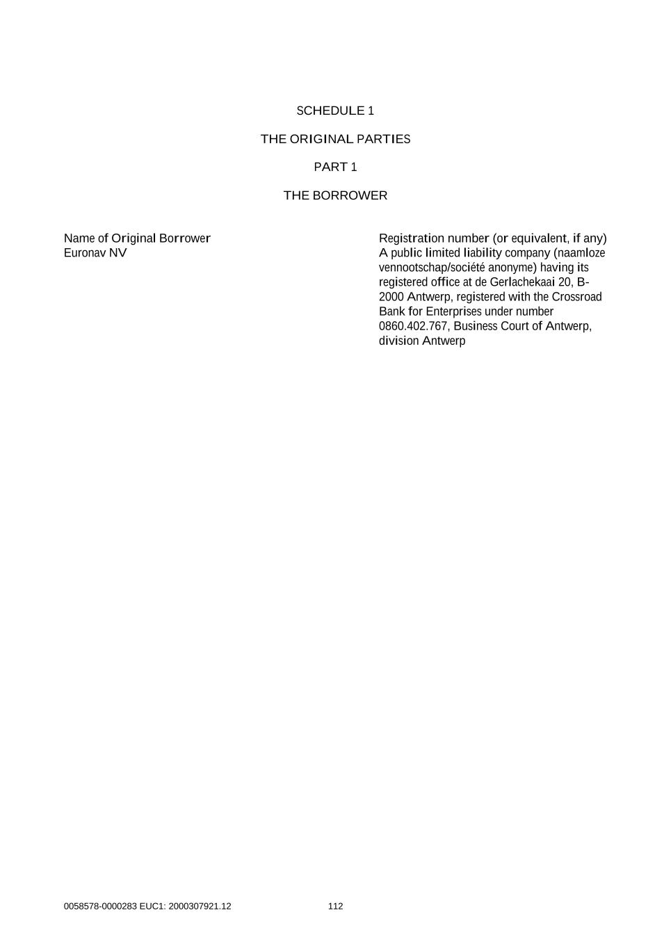0058578-0000283 EUC1: 2000307921.12 112 SCHEDULE 1 THE ORIGINAL PARTIES PART 1 THE BORROWER Name of Original Borrower Registration number (or equivalent, if any) Euronav NV A public limited liability company (naamloze vennootschap/société anonyme) having its registered office at de Gerlachekaai 20, B- 2000 Antwerp, registered with the Crossroad Bank for Enterprises under number 0860.402.767, Business Court of Antwerp, division Antwerp