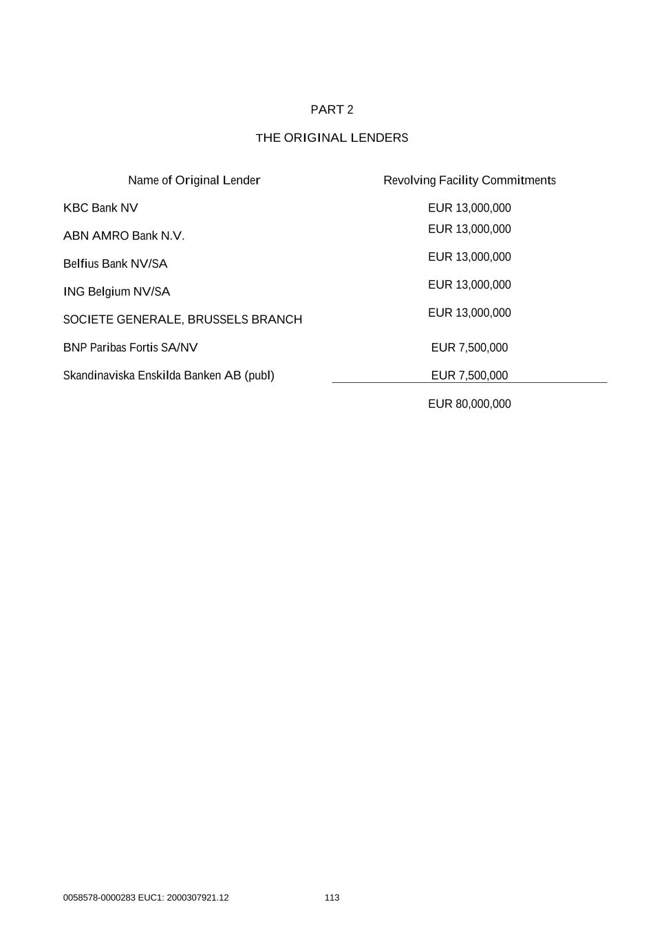 0058578-0000283 EUC1: 2000307921.12 113 PART 2 THE ORIGINAL LENDERS Name of Original Lender Revolving Facility Commitments KBC Bank NV EUR 13,000,000 ABN AMRO Bank N.V. EUR 13,000,000 Belfius Bank NV/SA EUR 13,000,000 ING Belgium NV/SA EUR 13,000,000 SOCIETE GENERALE, BRUSSELS BRANCH EUR 13,000,000 BNP Paribas Fortis SA/NV EUR 7,500,000 Skandinaviska Enskilda Banken AB (publ) EUR 7,500,000 EUR 80,000,000