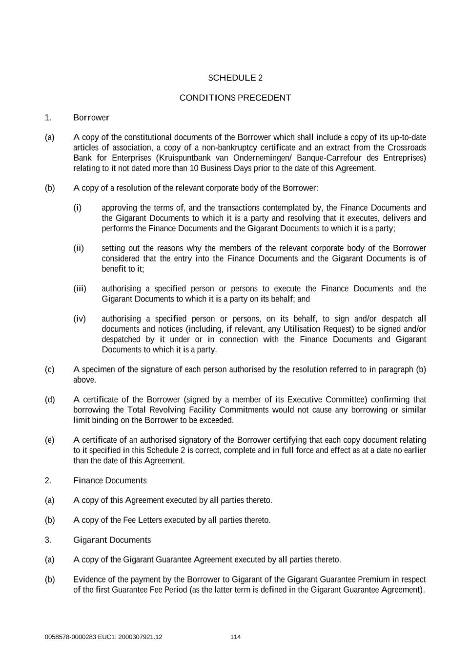 0058578-0000283 EUC1: 2000307921.12 114 SCHEDULE 2 CONDITIONS PRECEDENT 1. Borrower (a) A copy of the constitutional documents of the Borrower which shall include a copy of its up-to-date articles of association, a copy of a non-bankruptcy certificate and an extract from the Crossroads Bank for Enterprises (Kruispuntbank van Ondernemingen/ Banque-Carrefour des Entreprises) relating to it not dated more than 10 Business Days prior to the date of this Agreement. (b) A copy of a resolution of the relevant corporate body of the Borrower: (i) approving the terms of, and the transactions contemplated by, the Finance Documents and the Gigarant Documents to which it is a party and resolving that it executes, delivers and performs the Finance Documents and the Gigarant Documents to which it is a party; (ii) setting out the reasons why the members of the relevant corporate body of the Borrower considered that the entry into the Finance Documents and the Gigarant Documents is of benefit to it; (iii) authorising a specified person or persons to execute the Finance Documents and the Gigarant Documents to which it is a party on its behalf; and (iv) authorising a specified person or persons, on its behalf, to sign and/or despatch all documents and notices (including, if relevant, any Utilisation Request) to be signed and/or despatched by it under or in connection with the Finance Documents and Gigarant Documents to which it is a party. (c) A specimen of the signature of each person authorised by the resolution referred to in paragraph (b) above. (d) A certificate of the Borrower (signed by a member of its Executive Committee) confirming that borrowing the Total Revolving Facility Commitments would not cause any borrowing or similar limit binding on the Borrower to be exceeded. (e) A certificate of an authorised signatory of the Borrower certifying that each copy document relating to it specified in this Schedule 2 is correct, complete and in full force and effect as at a date no earlier than the date of this Agreement. 2. Finance Documents (a) A copy of this Agreement executed by all parties thereto. (b) A copy of the Fee Letters executed by all parties thereto. 3. Gigarant Documents (a) A copy of the Gigarant Guarantee Agreement executed by all parties thereto. (b) Evidence of the payment by the Borrower to Gigarant of the Gigarant Guarantee Premium in respect of the first Guarantee Fee Period (as the latter term is defined in the Gigarant Guarantee Agreement).