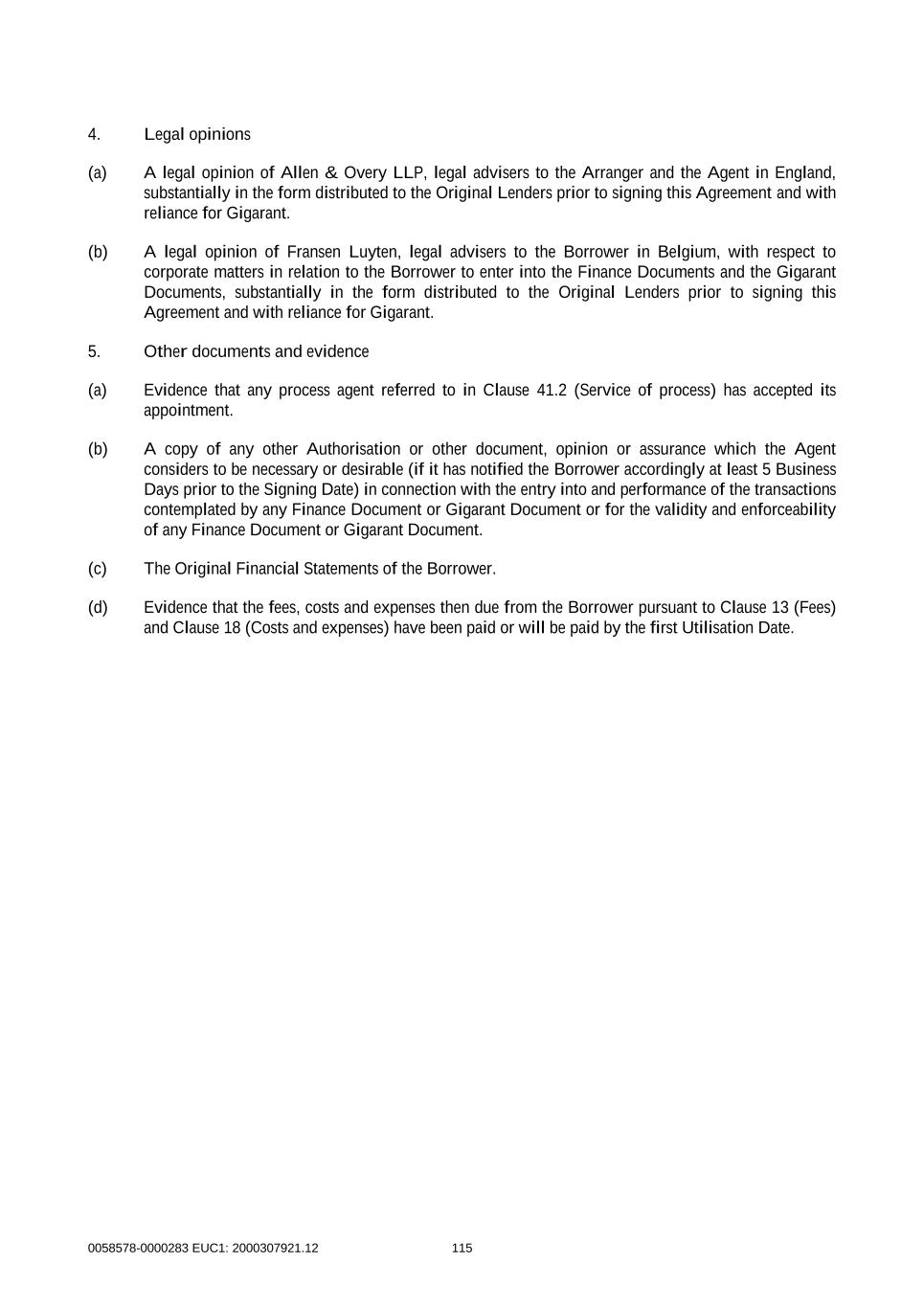 0058578-0000283 EUC1: 2000307921.12 115 4. Legal opinions (a) A legal opinion of Allen & Overy LLP, legal advisers to the Arranger and the Agent in England, substantially in the form distributed to the Original Lenders prior to signing this Agreement and with reliance for Gigarant. (b) A legal opinion of Fransen Luyten, legal advisers to the Borrower in Belgium, with respect to corporate matters in relation to the Borrower to enter into the Finance Documents and the Gigarant Documents, substantially in the form distributed to the Original Lenders prior to signing this Agreement and with reliance for Gigarant. 5. Other documents and evidence (a) Evidence that any process agent referred to in Clause 41.2 (Service of process) has accepted its appointment. (b) A copy of any other Authorisation or other document, opinion or assurance which the Agent considers to be necessary or desirable (if it has notified the Borrower accordingly at least 5 Business Days prior to the Signing Date) in connection with the entry into and performance of the transactions contemplated by any Finance Document or Gigarant Document or for the validity and enforceability of any Finance Document or Gigarant Document. (c) The Original Financial Statements of the Borrower. (d) Evidence that the fees, costs and expenses then due from the Borrower pursuant to Clause 13 (Fees) and Clause 18 (Costs and expenses) have been paid or will be paid by the first Utilisation Date.
