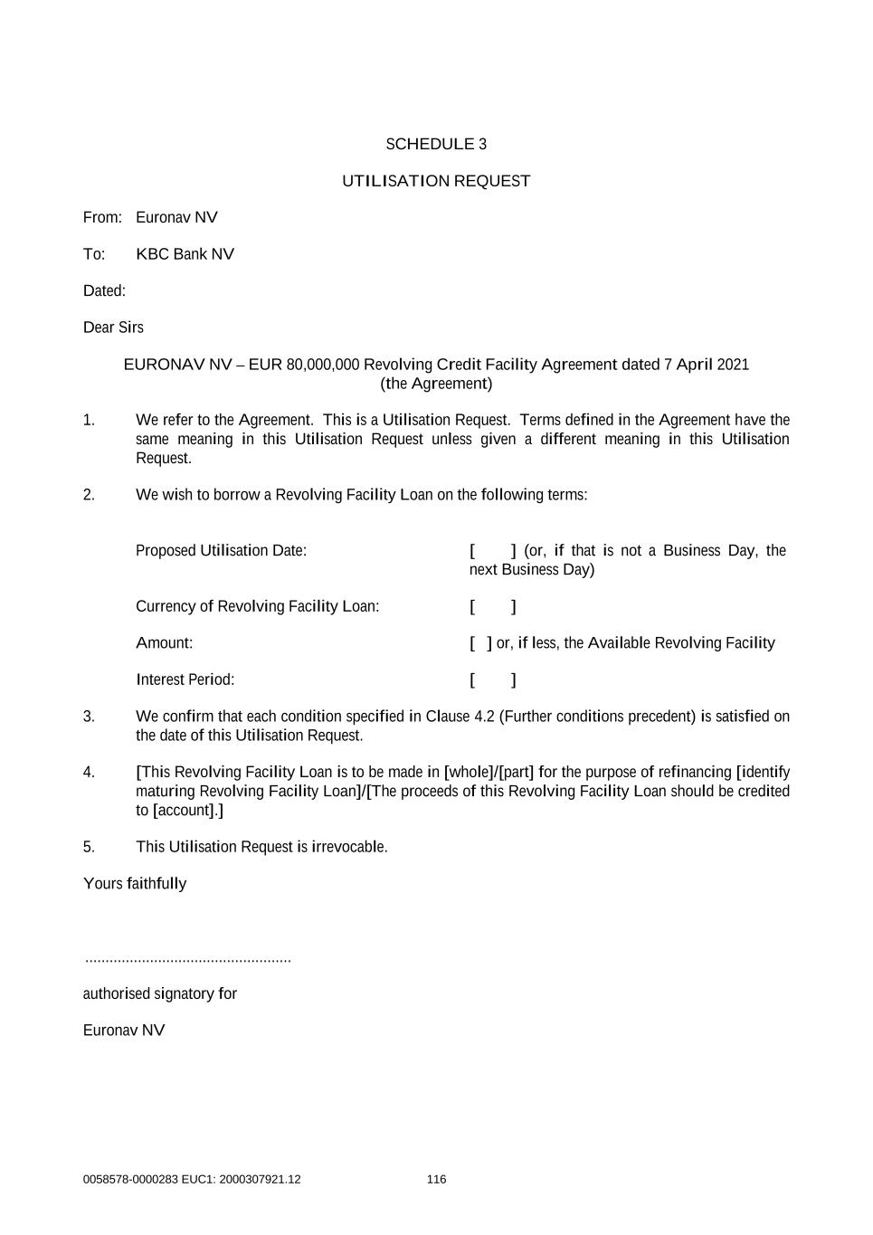 0058578-0000283 EUC1: 2000307921.12 116 SCHEDULE 3 UTILISATION REQUEST From: Euronav NV To: KBC Bank NV Dated: Dear Sirs EURONAV NV – EUR 80,000,000 Revolving Credit Facility Agreement dated 7 April 2021 (the Agreement) 1. We refer to the Agreement. This is a Utilisation Request. Terms defined in the Agreement have the same meaning in this Utilisation Request unless given a different meaning in this Utilisation Request. 2. We wish to borrow a Revolving Facility Loan on the following terms: Proposed Utilisation Date: [ ] (or, if that is not a Business Day, the next Business Day) Currency of Revolving Facility Loan: [ ] Amount: [ ] or, if less, the Available Revolving Facility Interest Period: [ ] 3. We confirm that each condition specified in Clause 4.2 (Further conditions precedent) is satisfied on the date of this Utilisation Request. 4. [This Revolving Facility Loan is to be made in [whole]/[part] for the purpose of refinancing [identify maturing Revolving Facility Loan]/[The proceeds of this Revolving Facility Loan should be credited to [account].] 5. This Utilisation Request is irrevocable. Yours faithfully ................................................... authorised signatory for Euronav NV