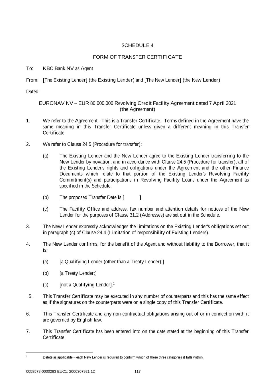 0058578-0000283 EUC1: 2000307921.12 117 SCHEDULE 4 FORM OF TRANSFER CERTIFICATE To: KBC Bank NV as Agent From: [The Existing Lender] (the Existing Lender) and [The New Lender] (the New Lender) Dated: EURONAV NV – EUR 80,000,000 Revolving Credit Facility Agreement dated 7 April 2021 (the Agreement) 1. We refer to the Agreement. This is a Transfer Certificate. Terms defined in the Agreement have the same meaning in this Transfer Certificate unless given a different meaning in this Transfer Certificate. 2. We refer to Clause 24.5 (Procedure for transfer): (a) The Existing Lender and the New Lender agree to the Existing Lender transferring to the New Lender by novation, and in accordance with Clause 24.5 (Procedure for transfer), all of the Existing Lender's rights and obligations under the Agreement and the other Finance Documents which relate to that portion of the Existing Lender's Revolving Facility Commitment(s) and participations in Revolving Facility Loans under the Agreement as specified in the Schedule. (b) The proposed Transfer Date is [ ]. (c) The Facility Office and address, fax number and attention details for notices of the New Lender for the purposes of Clause 31.2 (Addresses) are set out in the Schedule. 3. The New Lender expressly acknowledges the limitations on the Existing Lender's obligations set out in paragraph (c) of Clause 24.4 (Limitation of responsibility of Existing Lenders). 4. The New Lender confirms, for the benefit of the Agent and without liability to the Borrower, that it is: (a) [a Qualifying Lender (other than a Treaty Lender);] (b) [a Treaty Lender;] (c) [not a Qualifying Lender].1 5. This Transfer Certificate may be executed in any number of counterparts and this has the same effect as if the signatures on the counterparts were on a single copy of this Transfer Certificate. 6. This Transfer Certificate and any non-contractual obligations arising out of or in connection with it are governed by English law. 7. This Transfer Certificate has been entered into on the date stated at the beginning of this Transfer Certificate. 1 Delete as applicable – each New Lender is required to confirm which of these three categories it falls within.