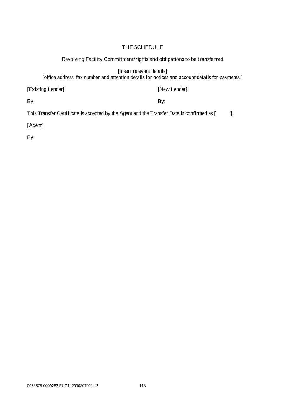 0058578-0000283 EUC1: 2000307921.12 118 THE SCHEDULE Revolving Facility Commitment/rights and obligations to be transferred [insert relevant details] [office address, fax number and attention details for notices and account details for payments,] [Existing Lender] [New Lender] By: By: This Transfer Certificate is accepted by the Agent and the Transfer Date is confirmed as [ ]. [Agent] By: