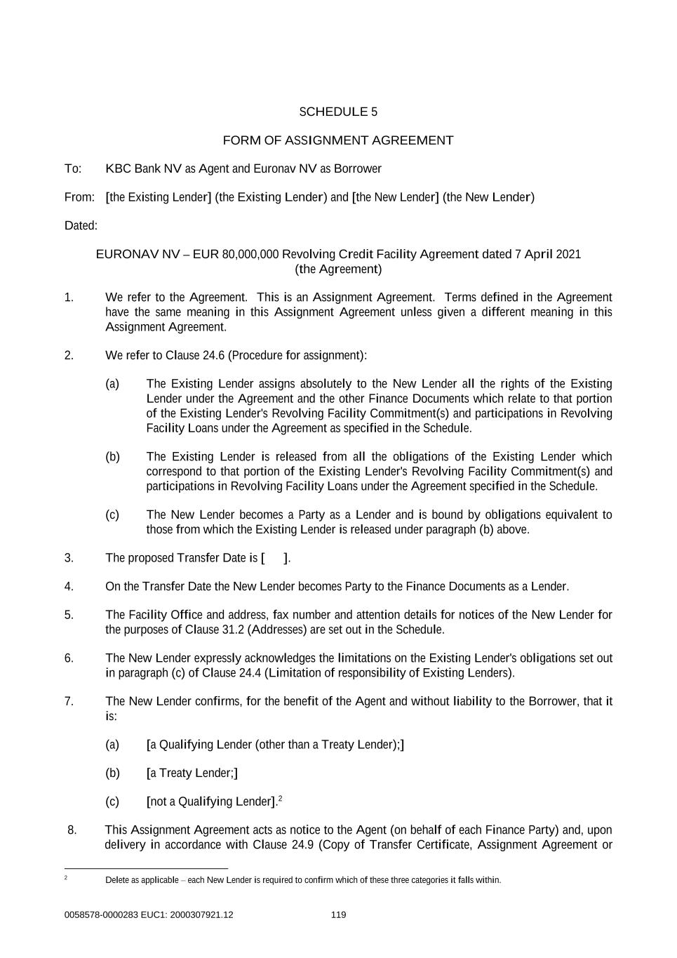 0058578-0000283 EUC1: 2000307921.12 119 SCHEDULE 5 FORM OF ASSIGNMENT AGREEMENT To: KBC Bank NV as Agent and Euronav NV as Borrower From: [the Existing Lender] (the Existing Lender) and [the New Lender] (the New Lender) Dated: EURONAV NV – EUR 80,000,000 Revolving Credit Facility Agreement dated 7 April 2021 (the Agreement) 1. We refer to the Agreement. This is an Assignment Agreement. Terms defined in the Agreement have the same meaning in this Assignment Agreement unless given a different meaning in this Assignment Agreement. 2. We refer to Clause 24.6 (Procedure for assignment): (a) The Existing Lender assigns absolutely to the New Lender all the rights of the Existing Lender under the Agreement and the other Finance Documents which relate to that portion of the Existing Lender's Revolving Facility Commitment(s) and participations in Revolving Facility Loans under the Agreement as specified in the Schedule. (b) The Existing Lender is released from all the obligations of the Existing Lender which correspond to that portion of the Existing Lender's Revolving Facility Commitment(s) and participations in Revolving Facility Loans under the Agreement specified in the Schedule. (c) The New Lender becomes a Party as a Lender and is bound by obligations equivalent to those from which the Existing Lender is released under paragraph (b) above. 3. The proposed Transfer Date is [ ]. 4. On the Transfer Date the New Lender becomes Party to the Finance Documents as a Lender. 5. The Facility Office and address, fax number and attention details for notices of the New Lender for the purposes of Clause 31.2 (Addresses) are set out in the Schedule. 6. The New Lender expressly acknowledges the limitations on the Existing Lender's obligations set out in paragraph (c) of Clause 24.4 (Limitation of responsibility of Existing Lenders). 7. The New Lender confirms, for the benefit of the Agent and without liability to the Borrower, that it is: (a) [a Qualifying Lender (other than a Treaty Lender);] (b) [a Treaty Lender;] (c) [not a Qualifying Lender].2 8. This Assignment Agreement acts as notice to the Agent (on behalf of each Finance Party) and, upon delivery in accordance with Clause 24.9 (Copy of Transfer Certificate, Assignment Agreement or 2 Delete as applicable – each New Lender is required to confirm which of these three categories it falls within.