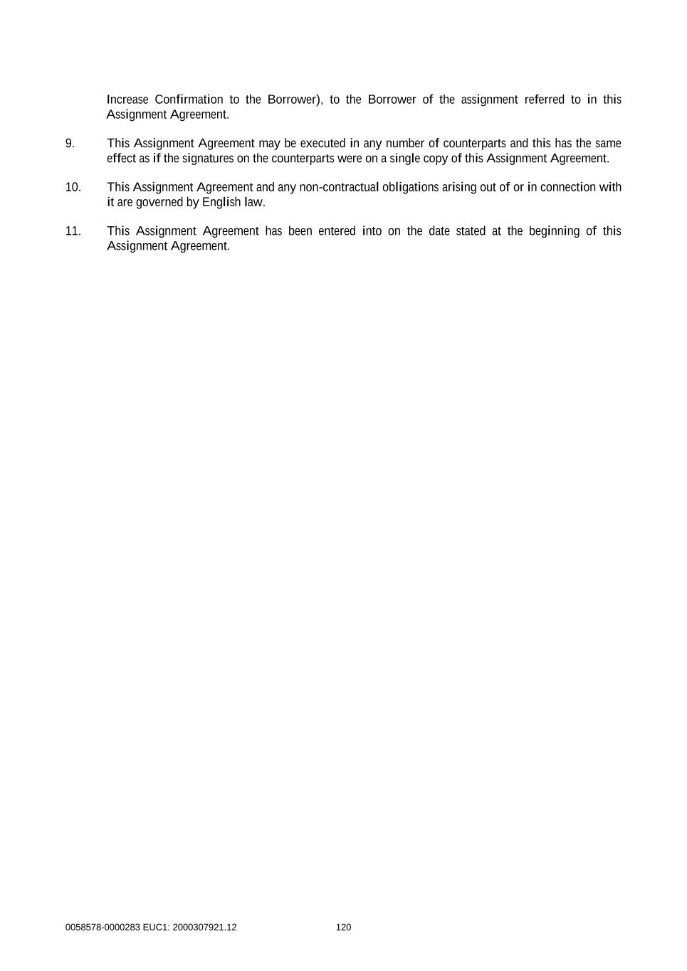 0058578-0000283 EUC1: 2000307921.12 120 Increase Confirmation to the Borrower), to the Borrower of the assignment referred to in this Assignment Agreement. 9. This Assignment Agreement may be executed in any number of counterparts and this has the same effect as if the signatures on the counterparts were on a single copy of this Assignment Agreement. 10. This Assignment Agreement and any non-contractual obligations arising out of or in connection with it are governed by English law. 11. This Assignment Agreement has been entered into on the date stated at the beginning of this Assignment Agreement.