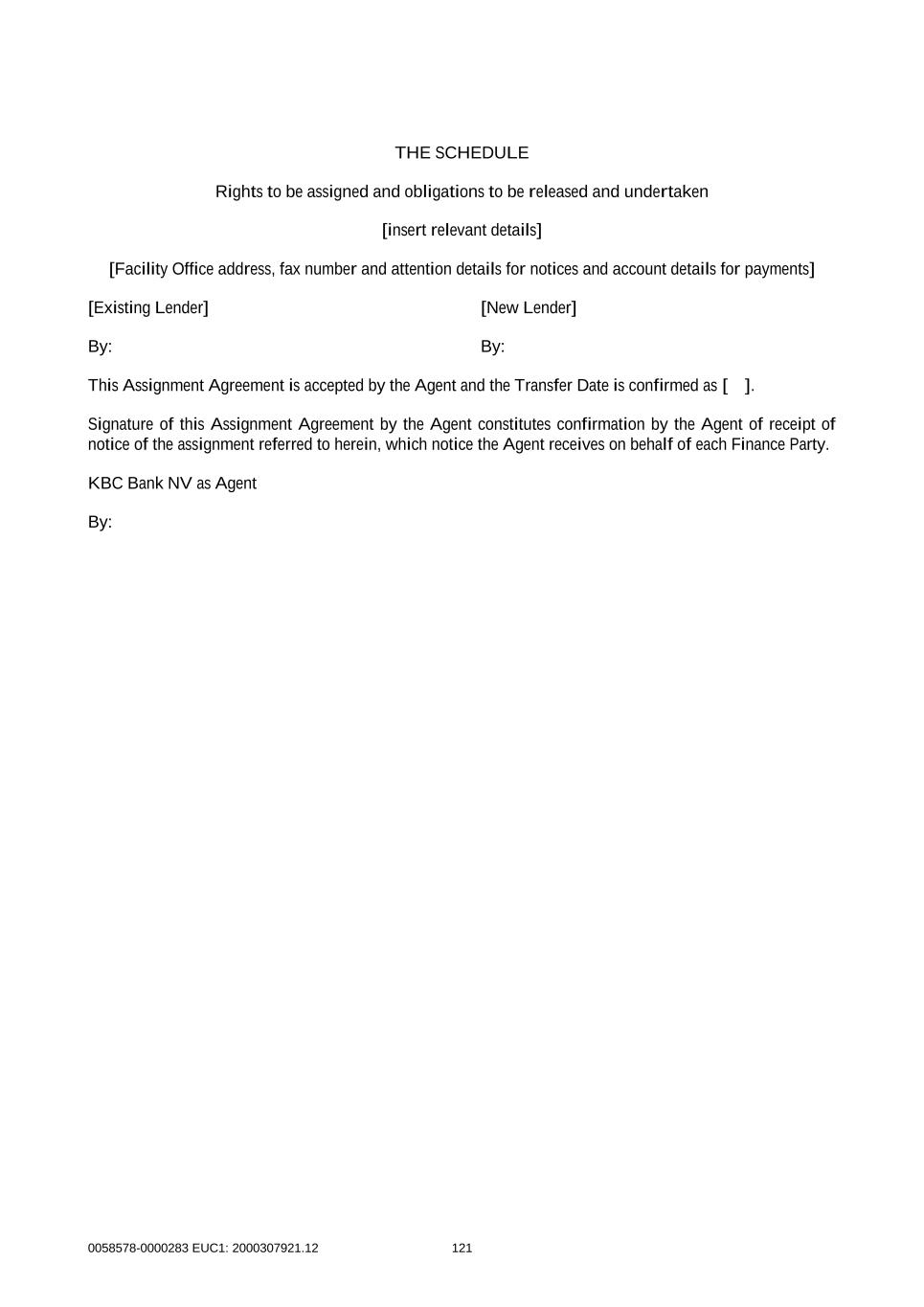 0058578-0000283 EUC1: 2000307921.12 121 THE SCHEDULE Rights to be assigned and obligations to be released and undertaken [insert relevant details] [Facility Office address, fax number and attention details for notices and account details for payments] [Existing Lender] [New Lender] By: By: This Assignment Agreement is accepted by the Agent and the Transfer Date is confirmed as [ ]. Signature of this Assignment Agreement by the Agent constitutes confirmation by the Agent of receipt of notice of the assignment referred to herein, which notice the Agent receives on behalf of each Finance Party. KBC Bank NV as Agent By: