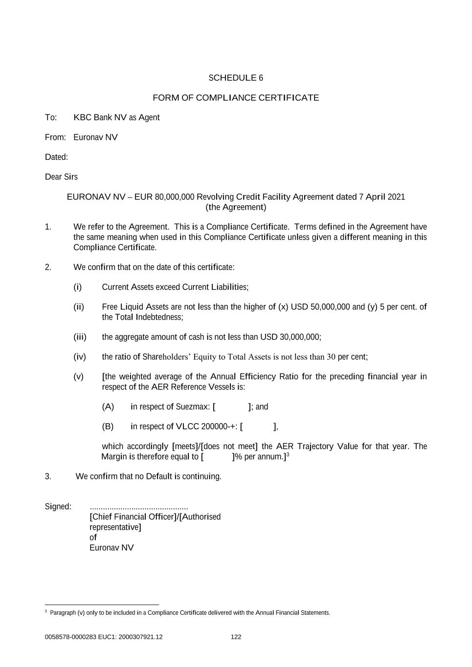 0058578-0000283 EUC1: 2000307921.12 122 SCHEDULE 6 FORM OF COMPLIANCE CERTIFICATE To: KBC Bank NV as Agent From: Euronav NV Dated: Dear Sirs EURONAV NV – EUR 80,000,000 Revolving Credit Facility Agreement dated 7 April 2021 (the Agreement) 1. We refer to the Agreement. This is a Compliance Certificate. Terms defined in the Agreement have the same meaning when used in this Compliance Certificate unless given a different meaning in this Compliance Certificate. 2. We confirm that on the date of this certificate: (i) Current Assets exceed Current Liabilities; (ii) Free Liquid Assets are not less than the higher of (x) USD 50,000,000 and (y) 5 per cent. of the Total Indebtedness; (iii) the aggregate amount of cash is not less than USD 30,000,000; (iv) the ratio of Shareholders’ Equity to Total Assets is not less than 30 per cent; (v) [the weighted average of the Annual Efficiency Ratio for the preceding financial year in respect of the AER Reference Vessels is: (A) in respect of Suezmax: [ ]; and (B) in respect of VLCC 200000-+: [ ], which accordingly [meets]/[does not meet] the AER Trajectory Value for that year. The Margin is therefore equal to [ ]% per annum.]3 3. We confirm that no Default is continuing. Signed: ............................................. [Chief Financial Officer]/[Authorised representative] of Euronav NV 3 Paragraph (v) only to be included in a Compliance Certificate delivered with the Annual Financial Statements.