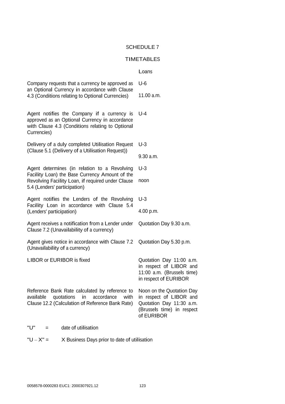 0058578-0000283 EUC1: 2000307921.12 123 SCHEDULE 7 TIMETABLES Loans Company requests that a currency be approved as an Optional Currency in accordance with Clause 4.3 (Conditions relating to Optional Currencies) U-6 11.00 a.m. Agent notifies the Company if a currency is approved as an Optional Currency in accordance with Clause 4.3 (Conditions relating to Optional Currencies) U-4 Delivery of a duly completed Utilisation Request (Clause 5.1 (Delivery of a Utilisation Request)) U-3 9.30 a.m. Agent determines (in relation to a Revolving Facility Loan) the Base Currency Amount of the Revolving Facility Loan, if required under Clause 5.4 (Lenders' participation) U-3 noon Agent notifies the Lenders of the Revolving Facility Loan in accordance with Clause 5.4 (Lenders' participation) U-3 4.00 p.m. Agent receives a notification from a Lender under Clause 7.2 (Unavailability of a currency) Quotation Day 9.30 a.m. Agent gives notice in accordance with Clause 7.2 (Unavailability of a currency) Quotation Day 5.30 p.m. LIBOR or EURIBOR is fixed Quotation Day 11:00 a.m. in respect of LIBOR and 11:00 a.m. (Brussels time) in respect of EURIBOR Reference Bank Rate calculated by reference to available quotations in accordance with Clause 12.2 (Calculation of Reference Bank Rate) Noon on the Quotation Day in respect of LIBOR and Quotation Day 11:30 a.m. (Brussels time) in respect of EURIBOR "U" = date of utilisation "U – X" = X Business Days prior to date of utilisation