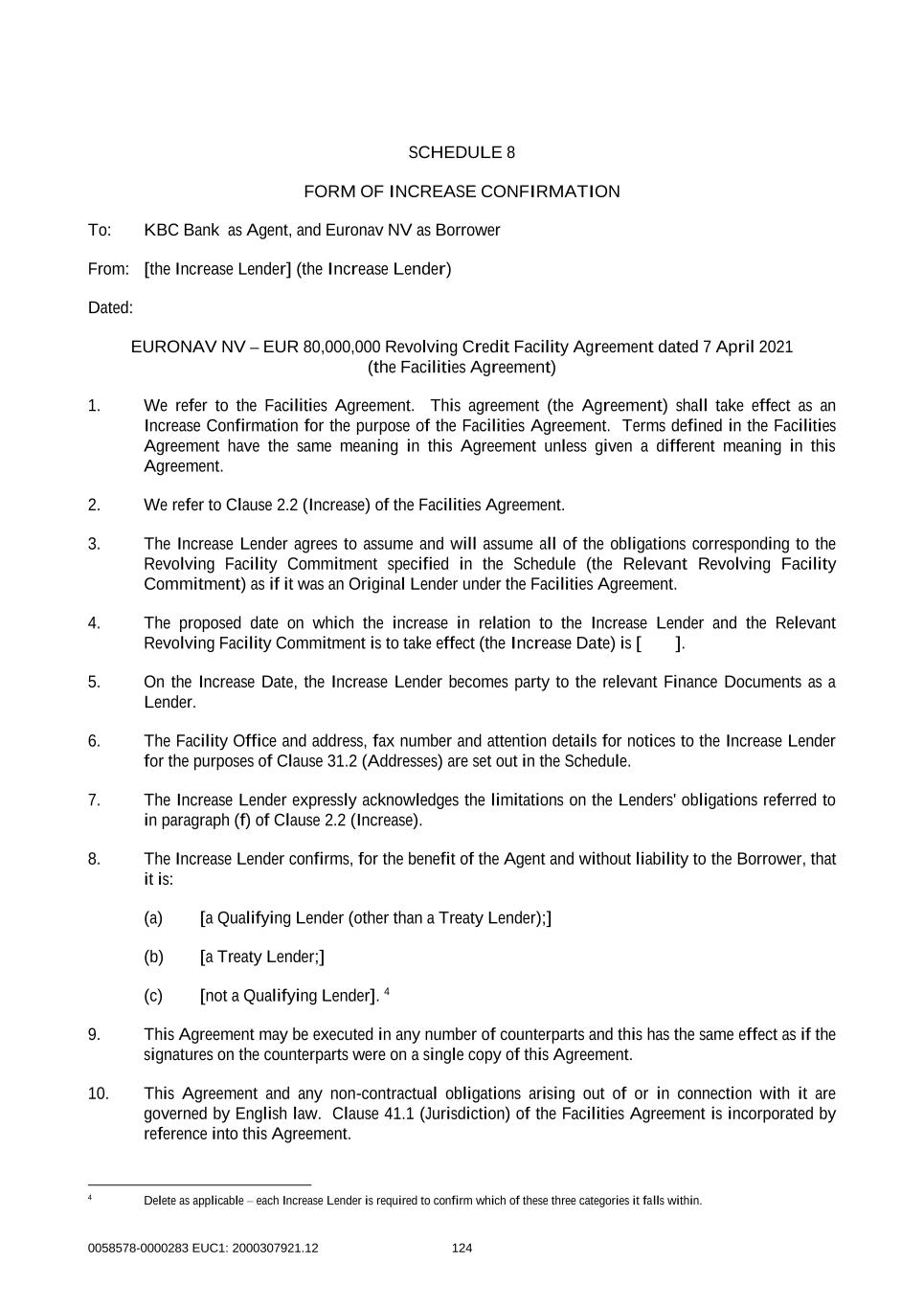 0058578-0000283 EUC1: 2000307921.12 124 SCHEDULE 8 FORM OF INCREASE CONFIRMATION To: KBC Bank as Agent, and Euronav NV as Borrower From: [the Increase Lender] (the Increase Lender) Dated: EURONAV NV – EUR 80,000,000 Revolving Credit Facility Agreement dated 7 April 2021 (the Facilities Agreement) 1. We refer to the Facilities Agreement. This agreement (the Agreement) shall take effect as an Increase Confirmation for the purpose of the Facilities Agreement. Terms defined in the Facilities Agreement have the same meaning in this Agreement unless given a different meaning in this Agreement. 2. We refer to Clause 2.2 (Increase) of the Facilities Agreement. 3. The Increase Lender agrees to assume and will assume all of the obligations corresponding to the Revolving Facility Commitment specified in the Schedule (the Relevant Revolving Facility Commitment) as if it was an Original Lender under the Facilities Agreement. 4. The proposed date on which the increase in relation to the Increase Lender and the Relevant Revolving Facility Commitment is to take effect (the Increase Date) is [ ]. 5. On the Increase Date, the Increase Lender becomes party to the relevant Finance Documents as a Lender. 6. The Facility Office and address, fax number and attention details for notices to the Increase Lender for the purposes of Clause 31.2 (Addresses) are set out in the Schedule. 7. The Increase Lender expressly acknowledges the limitations on the Lenders' obligations referred to in paragraph (f) of Clause 2.2 (Increase). 8. The Increase Lender confirms, for the benefit of the Agent and without liability to the Borrower, that it is: (a) [a Qualifying Lender (other than a Treaty Lender);] (b) [a Treaty Lender;] (c) [not a Qualifying Lender]. 4 9. This Agreement may be executed in any number of counterparts and this has the same effect as if the signatures on the counterparts were on a single copy of this Agreement. 10. This Agreement and any non-contractual obligations arising out of or in connection with it are governed by English law. Clause 41.1 (Jurisdiction) of the Facilities Agreement is incorporated by reference into this Agreement. 4 Delete as applicable – each Increase Lender is required to confirm which of these three categories it falls within.