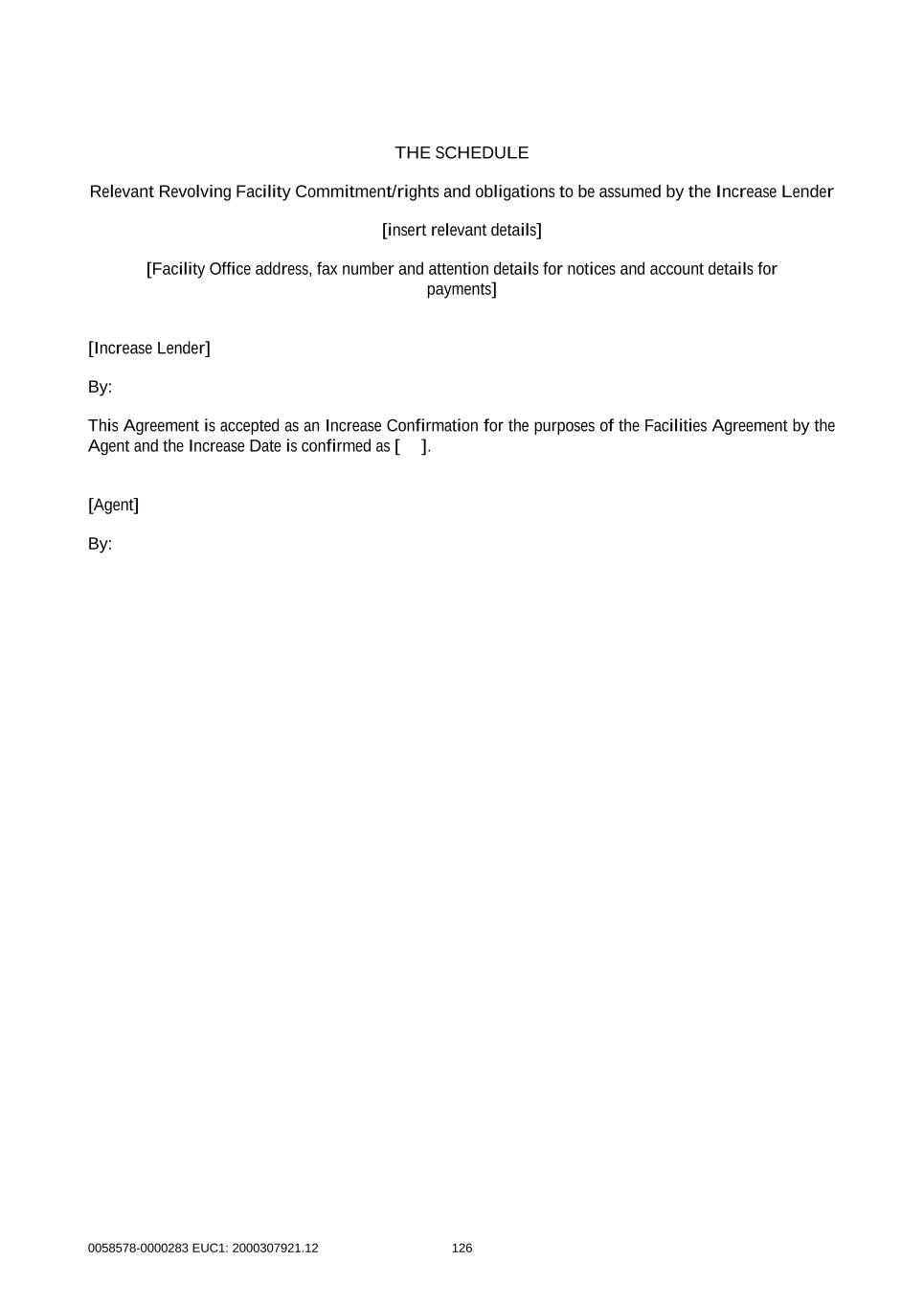 0058578-0000283 EUC1: 2000307921.12 126 THE SCHEDULE Relevant Revolving Facility Commitment/rights and obligations to be assumed by the Increase Lender [insert relevant details] [Facility Office address, fax number and attention details for notices and account details for payments] [Increase Lender] By: This Agreement is accepted as an Increase Confirmation for the purposes of the Facilities Agreement by the Agent and the Increase Date is confirmed as [ ]. [Agent] By: