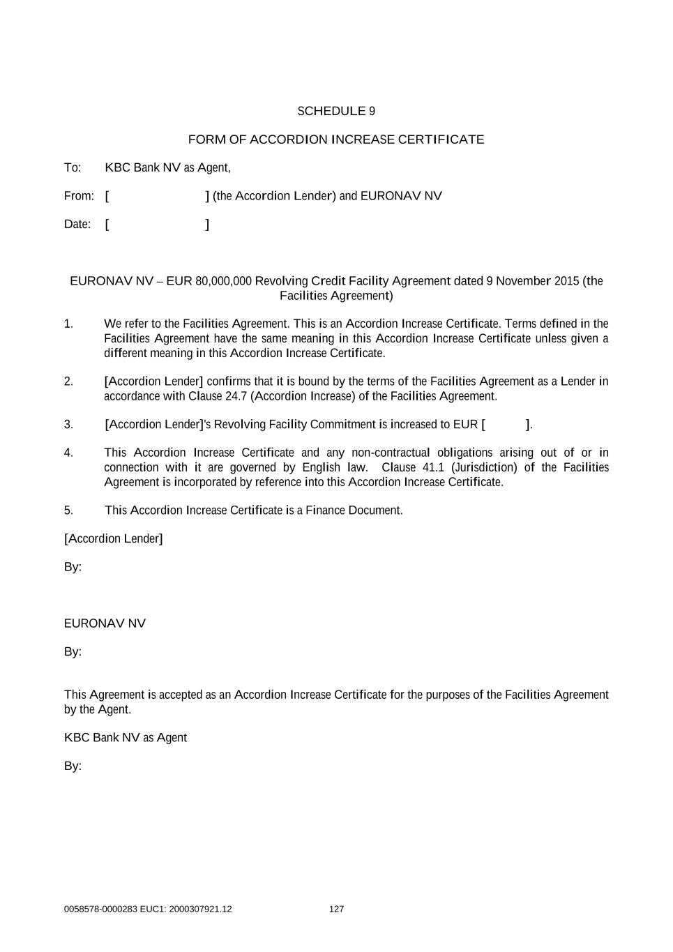 0058578-0000283 EUC1: 2000307921.12 127 SCHEDULE 9 FORM OF ACCORDION INCREASE CERTIFICATE To: KBC Bank NV as Agent, From: [ ] (the Accordion Lender) and EURONAV NV Date: [ ] EURONAV NV – EUR 80,000,000 Revolving Credit Facility Agreement dated 9 November 2015 (the Facilities Agreement) 1. We refer to the Facilities Agreement. This is an Accordion Increase Certificate. Terms defined in the Facilities Agreement have the same meaning in this Accordion Increase Certificate unless given a different meaning in this Accordion Increase Certificate. 2. [Accordion Lender] confirms that it is bound by the terms of the Facilities Agreement as a Lender in accordance with Clause 24.7 (Accordion Increase) of the Facilities Agreement. 3. [Accordion Lender]'s Revolving Facility Commitment is increased to EUR [ ]. 4. This Accordion Increase Certificate and any non-contractual obligations arising out of or in connection with it are governed by English law. Clause 41.1 (Jurisdiction) of the Facilities Agreement is incorporated by reference into this Accordion Increase Certificate. 5. This Accordion Increase Certificate is a Finance Document. [Accordion Lender] By: EURONAV NV By: This Agreement is accepted as an Accordion Increase Certificate for the purposes of the Facilities Agreement by the Agent. KBC Bank NV as Agent By: