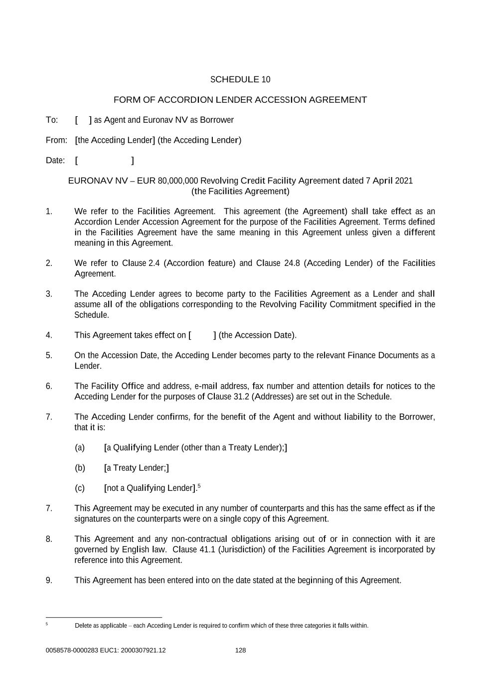 0058578-0000283 EUC1: 2000307921.12 128 SCHEDULE 10 FORM OF ACCORDION LENDER ACCESSION AGREEMENT To: [ ] as Agent and Euronav NV as Borrower From: [the Acceding Lender] (the Acceding Lender) Date: [ ] EURONAV NV – EUR 80,000,000 Revolving Credit Facility Agreement dated 7 April 2021 (the Facilities Agreement) 1. We refer to the Facilities Agreement. This agreement (the Agreement) shall take effect as an Accordion Lender Accession Agreement for the purpose of the Facilities Agreement. Terms defined in the Facilities Agreement have the same meaning in this Agreement unless given a different meaning in this Agreement. 2. We refer to Clause 2.4 (Accordion feature) and Clause 24.8 (Acceding Lender) of the Facilities Agreement. 3. The Acceding Lender agrees to become party to the Facilities Agreement as a Lender and shall assume all of the obligations corresponding to the Revolving Facility Commitment specified in the Schedule. 4. This Agreement takes effect on [ ] (the Accession Date). 5. On the Accession Date, the Acceding Lender becomes party to the relevant Finance Documents as a Lender. 6. The Facility Office and address, e-mail address, fax number and attention details for notices to the Acceding Lender for the purposes of Clause 31.2 (Addresses) are set out in the Schedule. 7. The Acceding Lender confirms, for the benefit of the Agent and without liability to the Borrower, that it is: (a) [a Qualifying Lender (other than a Treaty Lender);] (b) [a Treaty Lender;] (c) [not a Qualifying Lender].5 7. This Agreement may be executed in any number of counterparts and this has the same effect as if the signatures on the counterparts were on a single copy of this Agreement. 8. This Agreement and any non-contractual obligations arising out of or in connection with it are governed by English law. Clause 41.1 (Jurisdiction) of the Facilities Agreement is incorporated by reference into this Agreement. 9. This Agreement has been entered into on the date stated at the beginning of this Agreement. 5 Delete as applicable – each Acceding Lender is required to confirm which of these three categories it falls within.