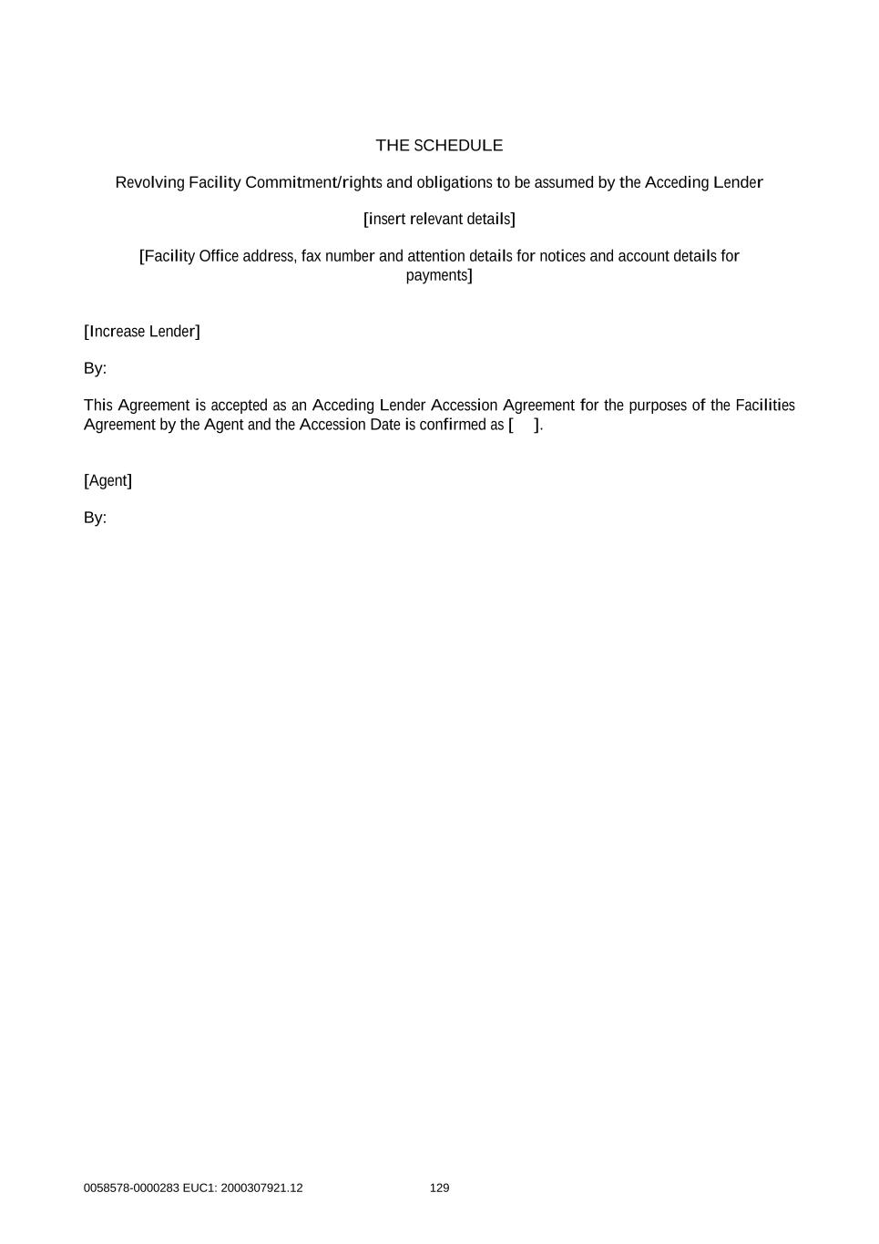 0058578-0000283 EUC1: 2000307921.12 129 THE SCHEDULE Revolving Facility Commitment/rights and obligations to be assumed by the Acceding Lender [insert relevant details] [Facility Office address, fax number and attention details for notices and account details for payments] [Increase Lender] By: This Agreement is accepted as an Acceding Lender Accession Agreement for the purposes of the Facilities Agreement by the Agent and the Accession Date is confirmed as [ ]. [Agent] By: