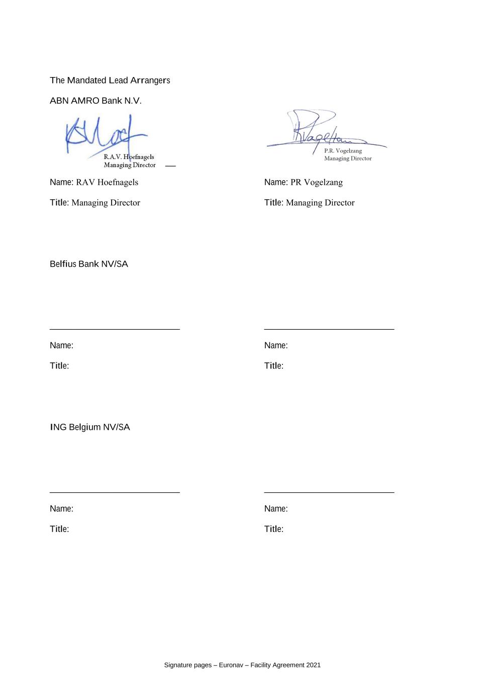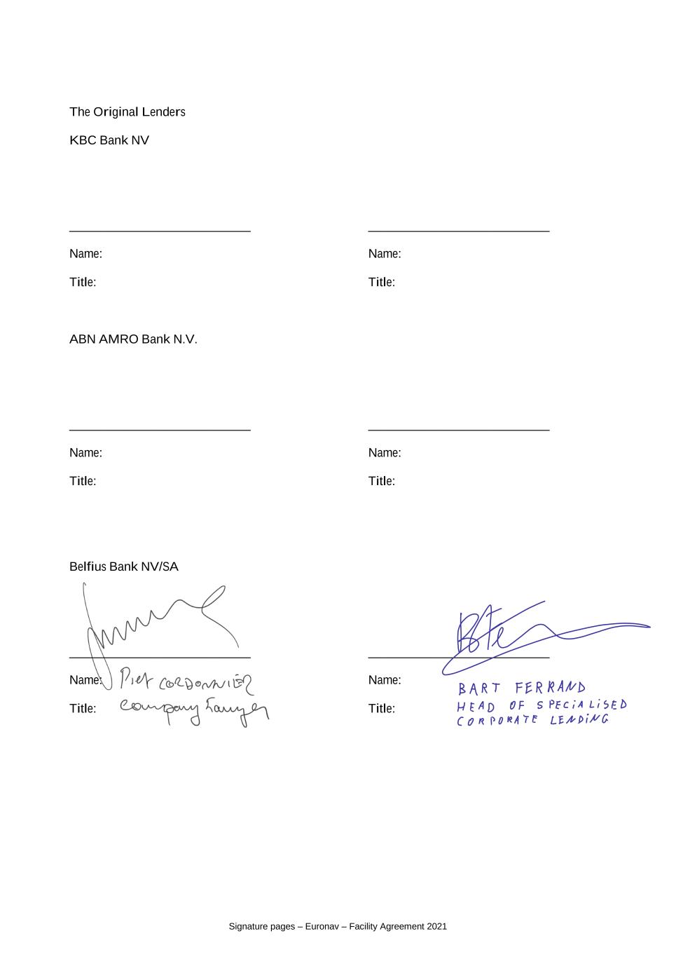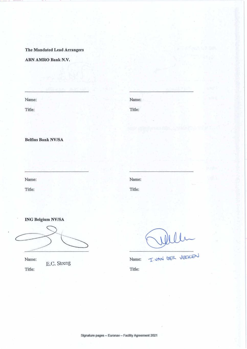 Signature pages – Euronav – Facility Agreement 2021 The Mandated Lead Arrangers ABN AMRO Bank N.V. ____________________________ Name: RAV Hoefnagels Title: Managing Director ____________________________ Name: PR Vogelzang Title: Managing Director Belfius Bank NV/SA _____________________________ _____________________________ Name: Name: Title: Title: ING Belgium NV/SA _____________________________ _____________________________ Name: Name: Title: Title: