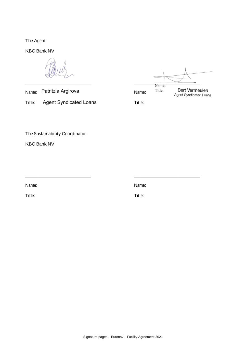Signature pages – Euronav – Facility Agreement 2021 The Agent KBC Bank NV _____________________________ _____________________________ Name: Name: Title: Title: The Sustainability Coordinator KBC Bank NV _____________________________ _____________________________ Name: Name: Title: Title: Patritzia Argirova Agent Syndicated Loans
