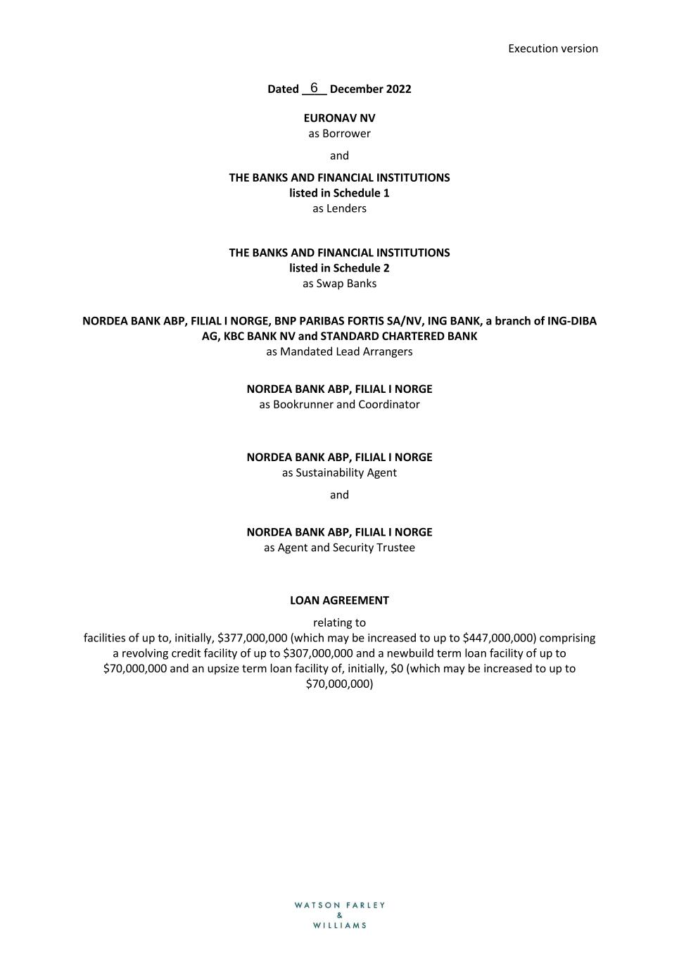 Execution version Dated ____ December 2022 EURONAV NV as Borrower and THE BANKS AND FINANCIAL INSTITUTIONS listed in Schedule 1 as Lenders THE BANKS AND FINANCIAL INSTITUTIONS listed in Schedule 2 as Swap Banks NORDEA BANK ABP, FILIAL I NORGE, BNP PARIBAS FORTIS SA/NV, ING BANK, a branch of ING-DIBA AG, KBC BANK NV and STANDARD CHARTERED BANK as Mandated Lead Arrangers NORDEA BANK ABP, FILIAL I NORGE as Bookrunner and Coordinator NORDEA BANK ABP, FILIAL I NORGE as Sustainability Agent and NORDEA BANK ABP, FILIAL I NORGE as Agent and Security Trustee LOAN AGREEMENT relating to facilities of up to, initially, $377,000,000 (which may be increased to up to $447,000,000) comprising a revolving credit facility of up to $307,000,000 and a newbuild term loan facility of up to $70,000,000 and an upsize term loan facility of, initially, $0 (which may be increased to up to $70,000,000) 6
