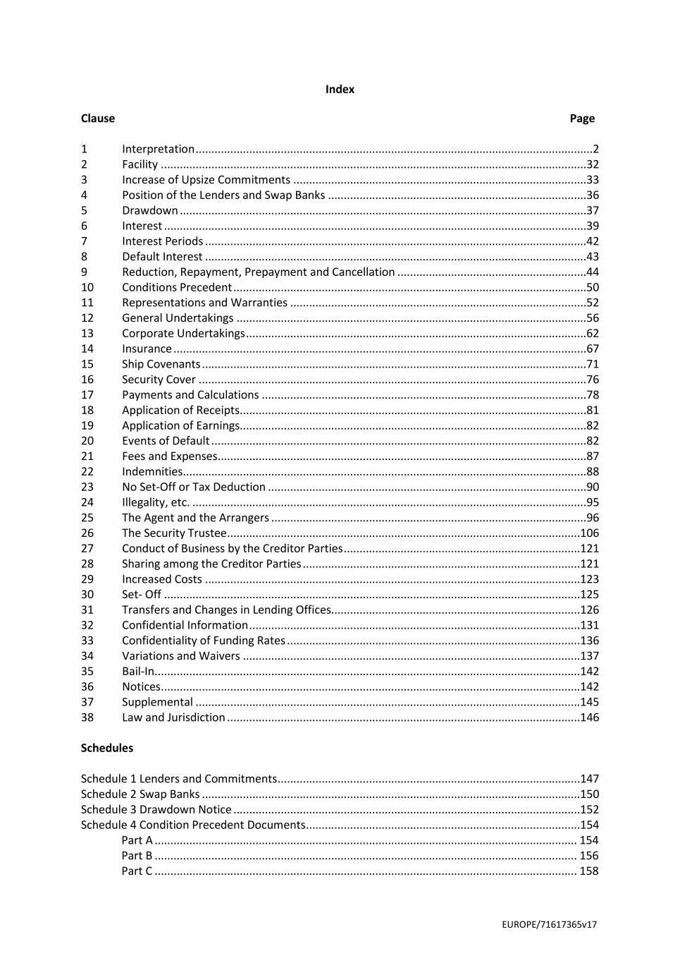 EUROPE/71617365v17 Index Clause Page 1 Interpretation .............................................................................................................................. 2 2 Facility .......................................................................................................................................32 3 Increase of Upsize Commitments .............................................................................................33 4 Position of the Lenders and Swap Banks ..................................................................................36 5 Drawdown .................................................................................................................................37 6 Interest ......................................................................................................................................39 7 Interest Periods .........................................................................................................................42 8 Default Interest .........................................................................................................................43 9 Reduction, Repayment, Prepayment and Cancellation ............................................................44 10 Conditions Precedent ................................................................................................................50 11 Representations and Warranties ..............................................................................................52 12 General Undertakings ...............................................................................................................56 13 Corporate Undertakings ............................................................................................................62 14 Insurance ...................................................................................................................................67 15 Ship Covenants ..........................................................................................................................71 16 Security Cover ...........................................................................................................................76 17 Payments and Calculations .......................................................................................................78 18 Application of Receipts ..............................................................................................................81 19 Application of Earnings..............................................................................................................82 20 Events of Default .......................................................................................................................82 21 Fees and Expenses .....................................................................................................................87 22 Indemnities ................................................................................................................................88 23 No Set-Off or Tax Deduction .....................................................................................................90 24 Illegality, etc. .............................................................................................................................95 25 The Agent and the Arrangers ....................................................................................................96 26 The Security Trustee ................................................................................................................106 27 Conduct of Business by the Creditor Parties ...........................................................................121 28 Sharing among the Creditor Parties ........................................................................................121 29 Increased Costs .......................................................................................................................123 30 Set- Off ....................................................................................................................................125 31 Transfers and Changes in Lending Offices...............................................................................126 32 Confidential Information .........................................................................................................131 33 Confidentiality of Funding Rates .............................................................................................136 34 Variations and Waivers ...........................................................................................................137 35 Bail-In .......................................................................................................................................142 36 Notices .....................................................................................................................................142 37 Supplemental ..........................................................................................................................145 38 Law and Jurisdiction ................................................................................................................146 Schedules Schedule 1 Lenders and Commitments ................................................................................................147 Schedule 2 Swap Banks ........................................................................................................................150 Schedule 3 Drawdown Notice ..............................................................................................................152 Schedule 4 Condition Precedent Documents .......................................................................................154 Part A ...............................................................................................................