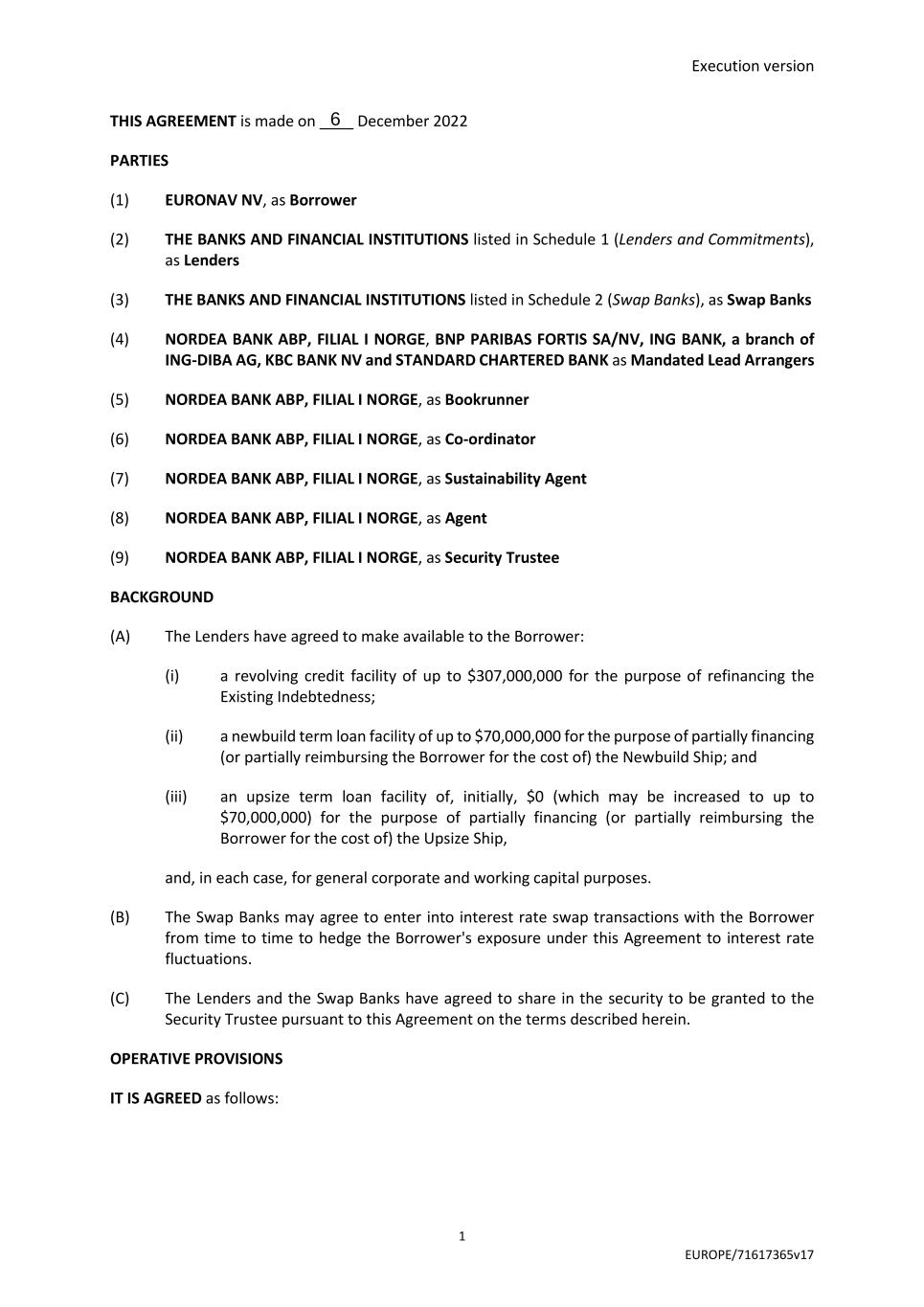 Execution version 1 EUROPE/71617365v17 THIS AGREEMENT is made on ____ December 2022 PARTIES (1) EURONAV NV, as Borrower (2) THE BANKS AND FINANCIAL INSTITUTIONS listed in Schedule 1 (Lenders and Commitments), as Lenders (3) THE BANKS AND FINANCIAL INSTITUTIONS listed in Schedule 2 (Swap Banks), as Swap Banks (4) NORDEA BANK ABP, FILIAL I NORGE, BNP PARIBAS FORTIS SA/NV, ING BANK, a branch of ING-DIBA AG, KBC BANK NV and STANDARD CHARTERED BANK as Mandated Lead Arrangers (5) NORDEA BANK ABP, FILIAL I NORGE, as Bookrunner (6) NORDEA BANK ABP, FILIAL I NORGE, as Co-ordinator (7) NORDEA BANK ABP, FILIAL I NORGE, as Sustainability Agent (8) NORDEA BANK ABP, FILIAL I NORGE, as Agent (9) NORDEA BANK ABP, FILIAL I NORGE, as Security Trustee BACKGROUND (A) The Lenders have agreed to make available to the Borrower: (i) a revolving credit facility of up to $307,000,000 for the purpose of refinancing the Existing Indebtedness; (ii) a newbuild term loan facility of up to $70,000,000 for the purpose of partially financing (or partially reimbursing the Borrower for the cost of) the Newbuild Ship; and (iii) an upsize term loan facility of, initially, $0 (which may be increased to up to $70,000,000) for the purpose of partially financing (or partially reimbursing the Borrower for the cost of) the Upsize Ship, and, in each case, for general corporate and working capital purposes. (B) The Swap Banks may agree to enter into interest rate swap transactions with the Borrower from time to time to hedge the Borrower's exposure under this Agreement to interest rate fluctuations. (C) The Lenders and the Swap Banks have agreed to share in the security to be granted to the Security Trustee pursuant to this Agreement on the terms described herein. OPERATIVE PROVISIONS IT IS AGREED as follows: 6