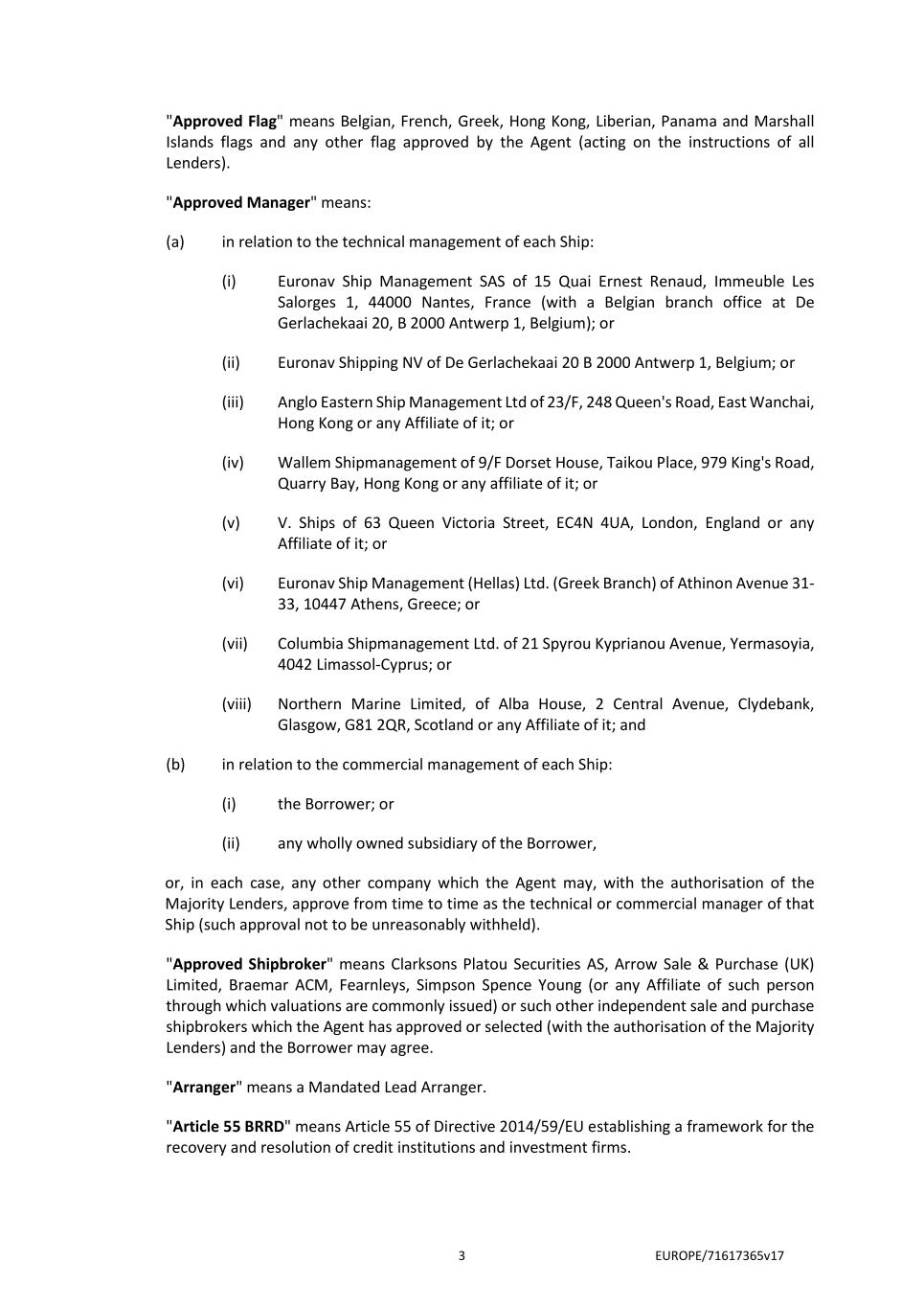 3 EUROPE/71617365v17 "Approved Flag" means Belgian, French, Greek, Hong Kong, Liberian, Panama and Marshall Islands flags and any other flag approved by the Agent (acting on the instructions of all Lenders). "Approved Manager" means: (a) in relation to the technical management of each Ship: (i) Euronav Ship Management SAS of 15 Quai Ernest Renaud, Immeuble Les Salorges 1, 44000 Nantes, France (with a Belgian branch office at De Gerlachekaai 20, B 2000 Antwerp 1, Belgium); or (ii) Euronav Shipping NV of De Gerlachekaai 20 B 2000 Antwerp 1, Belgium; or (iii) Anglo Eastern Ship Management Ltd of 23/F, 248 Queen's Road, East Wanchai, Hong Kong or any Affiliate of it; or (iv) Wallem Shipmanagement of 9/F Dorset House, Taikou Place, 979 King's Road, Quarry Bay, Hong Kong or any affiliate of it; or (v) V. Ships of 63 Queen Victoria Street, EC4N 4UA, London, England or any Affiliate of it; or (vi) Euronav Ship Management (Hellas) Ltd. (Greek Branch) of Athinon Avenue 31- 33, 10447 Athens, Greece; or (vii) Columbia Shipmanagement Ltd. of 21 Spyrou Kyprianou Avenue, Yermasoyia, 4042 Limassol-Cyprus; or (viii) Northern Marine Limited, of Alba House, 2 Central Avenue, Clydebank, Glasgow, G81 2QR, Scotland or any Affiliate of it; and (b) in relation to the commercial management of each Ship: (i) the Borrower; or (ii) any wholly owned subsidiary of the Borrower, or, in each case, any other company which the Agent may, with the authorisation of the Majority Lenders, approve from time to time as the technical or commercial manager of that Ship (such approval not to be unreasonably withheld). "Approved Shipbroker" means Clarksons Platou Securities AS, Arrow Sale & Purchase (UK) Limited, Braemar ACM, Fearnleys, Simpson Spence Young (or any Affiliate of such person through which valuations are commonly issued) or such other independent sale and purchase shipbrokers which the Agent has approved or selected (with the authorisation of the Majority Lenders) and the Borrower may agree. "Arranger" means a Mandated Lead Arranger. "Article 55 BRRD" means Article 55 of Directive 2014/59/EU establishing a framework for the recovery and resolution of credit institutions and investment firms.