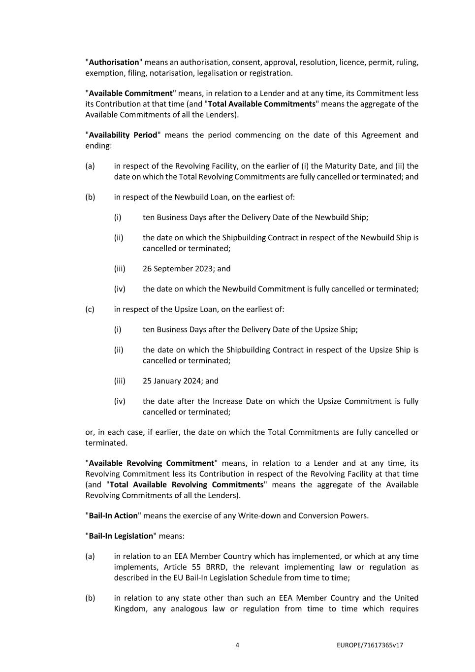 4 EUROPE/71617365v17 "Authorisation" means an authorisation, consent, approval, resolution, licence, permit, ruling, exemption, filing, notarisation, legalisation or registration. "Available Commitment" means, in relation to a Lender and at any time, its Commitment less its Contribution at that time (and "Total Available Commitments" means the aggregate of the Available Commitments of all the Lenders). "Availability Period" means the period commencing on the date of this Agreement and ending: (a) in respect of the Revolving Facility, on the earlier of (i) the Maturity Date, and (ii) the date on which the Total Revolving Commitments are fully cancelled or terminated; and (b) in respect of the Newbuild Loan, on the earliest of: (i) ten Business Days after the Delivery Date of the Newbuild Ship; (ii) the date on which the Shipbuilding Contract in respect of the Newbuild Ship is cancelled or terminated; (iii) 26 September 2023; and (iv) the date on which the Newbuild Commitment is fully cancelled or terminated; (c) in respect of the Upsize Loan, on the earliest of: (i) ten Business Days after the Delivery Date of the Upsize Ship; (ii) the date on which the Shipbuilding Contract in respect of the Upsize Ship is cancelled or terminated; (iii) 25 January 2024; and (iv) the date after the Increase Date on which the Upsize Commitment is fully cancelled or terminated; or, in each case, if earlier, the date on which the Total Commitments are fully cancelled or terminated. "Available Revolving Commitment" means, in relation to a Lender and at any time, its Revolving Commitment less its Contribution in respect of the Revolving Facility at that time (and "Total Available Revolving Commitments" means the aggregate of the Available Revolving Commitments of all the Lenders). "Bail-In Action" means the exercise of any Write-down and Conversion Powers. "Bail-In Legislation" means: (a) in relation to an EEA Member Country which has implemented, or which at any time implements, Article 55 BRRD, the relevant implementing law or regulation as described in the EU Bail-In Legislation Schedule from time to time; (b) in relation to any state other than such an EEA Member Country and the United Kingdom, any analogous law or regulation from time to time which requires