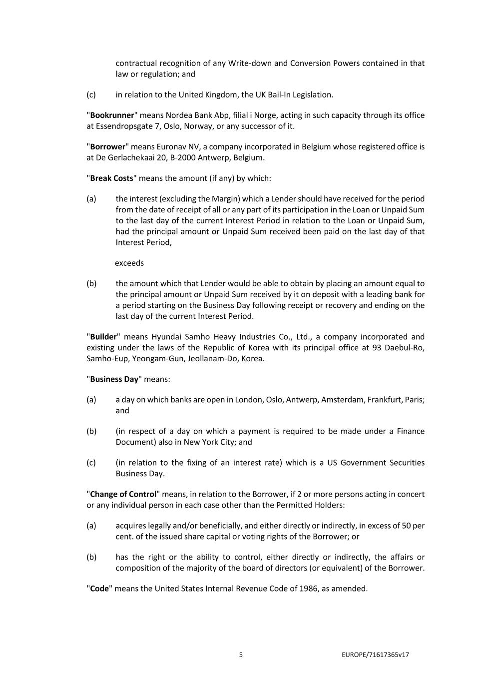 5 EUROPE/71617365v17 contractual recognition of any Write-down and Conversion Powers contained in that law or regulation; and (c) in relation to the United Kingdom, the UK Bail-In Legislation. "Bookrunner" means Nordea Bank Abp, filial i Norge, acting in such capacity through its office at Essendropsgate 7, Oslo, Norway, or any successor of it. "Borrower" means Euronav NV, a company incorporated in Belgium whose registered office is at De Gerlachekaai 20, B-2000 Antwerp, Belgium. "Break Costs" means the amount (if any) by which: (a) the interest (excluding the Margin) which a Lender should have received for the period from the date of receipt of all or any part of its participation in the Loan or Unpaid Sum to the last day of the current Interest Period in relation to the Loan or Unpaid Sum, had the principal amount or Unpaid Sum received been paid on the last day of that Interest Period, exceeds (b) the amount which that Lender would be able to obtain by placing an amount equal to the principal amount or Unpaid Sum received by it on deposit with a leading bank for a period starting on the Business Day following receipt or recovery and ending on the last day of the current Interest Period. "Builder" means Hyundai Samho Heavy Industries Co., Ltd., a company incorporated and existing under the laws of the Republic of Korea with its principal office at 93 Daebul-Ro, Samho-Eup, Yeongam-Gun, Jeollanam-Do, Korea. "Business Day" means: (a) a day on which banks are open in London, Oslo, Antwerp, Amsterdam, Frankfurt, Paris; and (b) (in respect of a day on which a payment is required to be made under a Finance Document) also in New York City; and (c) (in relation to the fixing of an interest rate) which is a US Government Securities Business Day. "Change of Control" means, in relation to the Borrower, if 2 or more persons acting in concert or any individual person in each case other than the Permitted Holders: (a) acquires legally and/or beneficially, and either directly or indirectly, in excess of 50 per cent. of the issued share capital or voting rights of the Borrower; or (b) has the right or the ability to control, either directly or indirectly, the affairs or composition of the majority of the board of directors (or equivalent) of the Borrower. "Code" means the United States Internal Revenue Code of 1986, as amended.