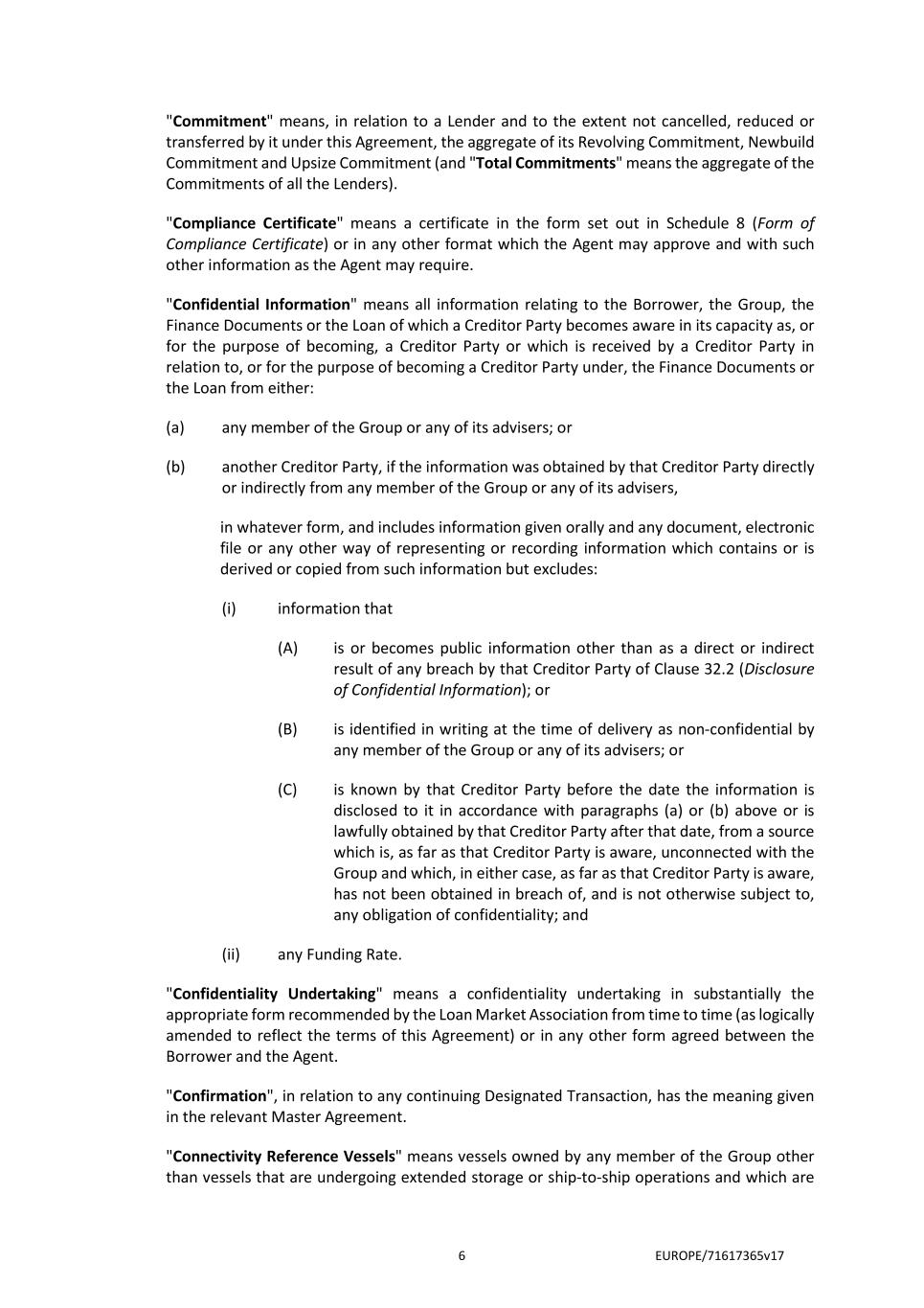 6 EUROPE/71617365v17 "Commitment" means, in relation to a Lender and to the extent not cancelled, reduced or transferred by it under this Agreement, the aggregate of its Revolving Commitment, Newbuild Commitment and Upsize Commitment (and "Total Commitments" means the aggregate of the Commitments of all the Lenders). "Compliance Certificate" means a certificate in the form set out in Schedule 8 (Form of Compliance Certificate) or in any other format which the Agent may approve and with such other information as the Agent may require. "Confidential Information" means all information relating to the Borrower, the Group, the Finance Documents or the Loan of which a Creditor Party becomes aware in its capacity as, or for the purpose of becoming, a Creditor Party or which is received by a Creditor Party in relation to, or for the purpose of becoming a Creditor Party under, the Finance Documents or the Loan from either: (a) any member of the Group or any of its advisers; or (b) another Creditor Party, if the information was obtained by that Creditor Party directly or indirectly from any member of the Group or any of its advisers, in whatever form, and includes information given orally and any document, electronic file or any other way of representing or recording information which contains or is derived or copied from such information but excludes: (i) information that (A) is or becomes public information other than as a direct or indirect result of any breach by that Creditor Party of Clause 32.2 (Disclosure of Confidential Information); or (B) is identified in writing at the time of delivery as non-confidential by any member of the Group or any of its advisers; or (C) is known by that Creditor Party before the date the information is disclosed to it in accordance with paragraphs (a) or (b) above or is lawfully obtained by that Creditor Party after that date, from a source which is, as far as that Creditor Party is aware, unconnected with the Group and which, in either case, as far as that Creditor Party is aware, has not been obtained in breach of, and is not otherwise subject to, any obligation of confidentiality; and (ii) any Funding Rate. "Confidentiality Undertaking" means a confidentiality undertaking in substantially the appropriate form recommended by the Loan Market Association from time to time (as logically amended to reflect the terms of this Agreement) or in any other form agreed between the Borrower and the Agent. "Confirmation", in relation to any continuing Designated Transaction, has the meaning given in the relevant Master Agreement. "Connectivity Reference Vessels" means vessels owned by any member of the Group other than vessels that are undergoing extended storage or ship-to-ship operations and which are