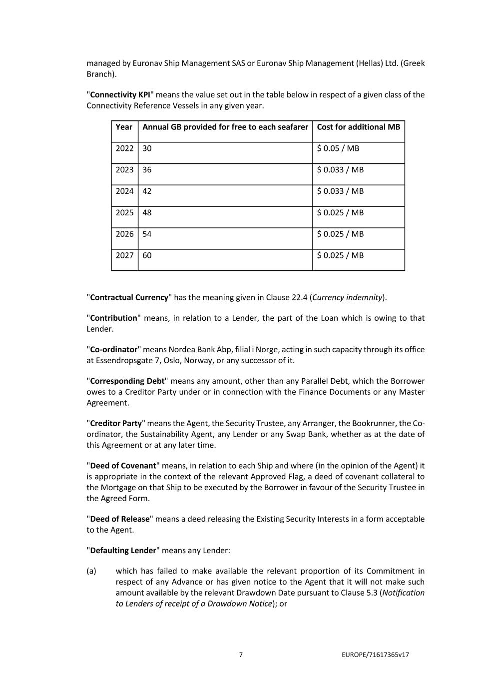 7 EUROPE/71617365v17 managed by Euronav Ship Management SAS or Euronav Ship Management (Hellas) Ltd. (Greek Branch). "Connectivity KPI" means the value set out in the table below in respect of a given class of the Connectivity Reference Vessels in any given year. Year Annual GB provided for free to each seafarer Cost for additional MB 2022 30 $ 0.05 / MB 2023 36 $ 0.033 / MB 2024 42 $ 0.033 / MB 2025 48 $ 0.025 / MB 2026 54 $ 0.025 / MB 2027 60 $ 0.025 / MB "Contractual Currency" has the meaning given in Clause 22.4 (Currency indemnity). "Contribution" means, in relation to a Lender, the part of the Loan which is owing to that Lender. "Co-ordinator" means Nordea Bank Abp, filial i Norge, acting in such capacity through its office at Essendropsgate 7, Oslo, Norway, or any successor of it. "Corresponding Debt" means any amount, other than any Parallel Debt, which the Borrower owes to a Creditor Party under or in connection with the Finance Documents or any Master Agreement. "Creditor Party" means the Agent, the Security Trustee, any Arranger, the Bookrunner, the Co- ordinator, the Sustainability Agent, any Lender or any Swap Bank, whether as at the date of this Agreement or at any later time. "Deed of Covenant" means, in relation to each Ship and where (in the opinion of the Agent) it is appropriate in the context of the relevant Approved Flag, a deed of covenant collateral to the Mortgage on that Ship to be executed by the Borrower in favour of the Security Trustee in the Agreed Form. "Deed of Release" means a deed releasing the Existing Security Interests in a form acceptable to the Agent. "Defaulting Lender" means any Lender: (a) which has failed to make available the relevant proportion of its Commitment in respect of any Advance or has given notice to the Agent that it will not make such amount available by the relevant Drawdown Date pursuant to Clause 5.3 (Notification to Lenders of receipt of a Drawdown Notice); or