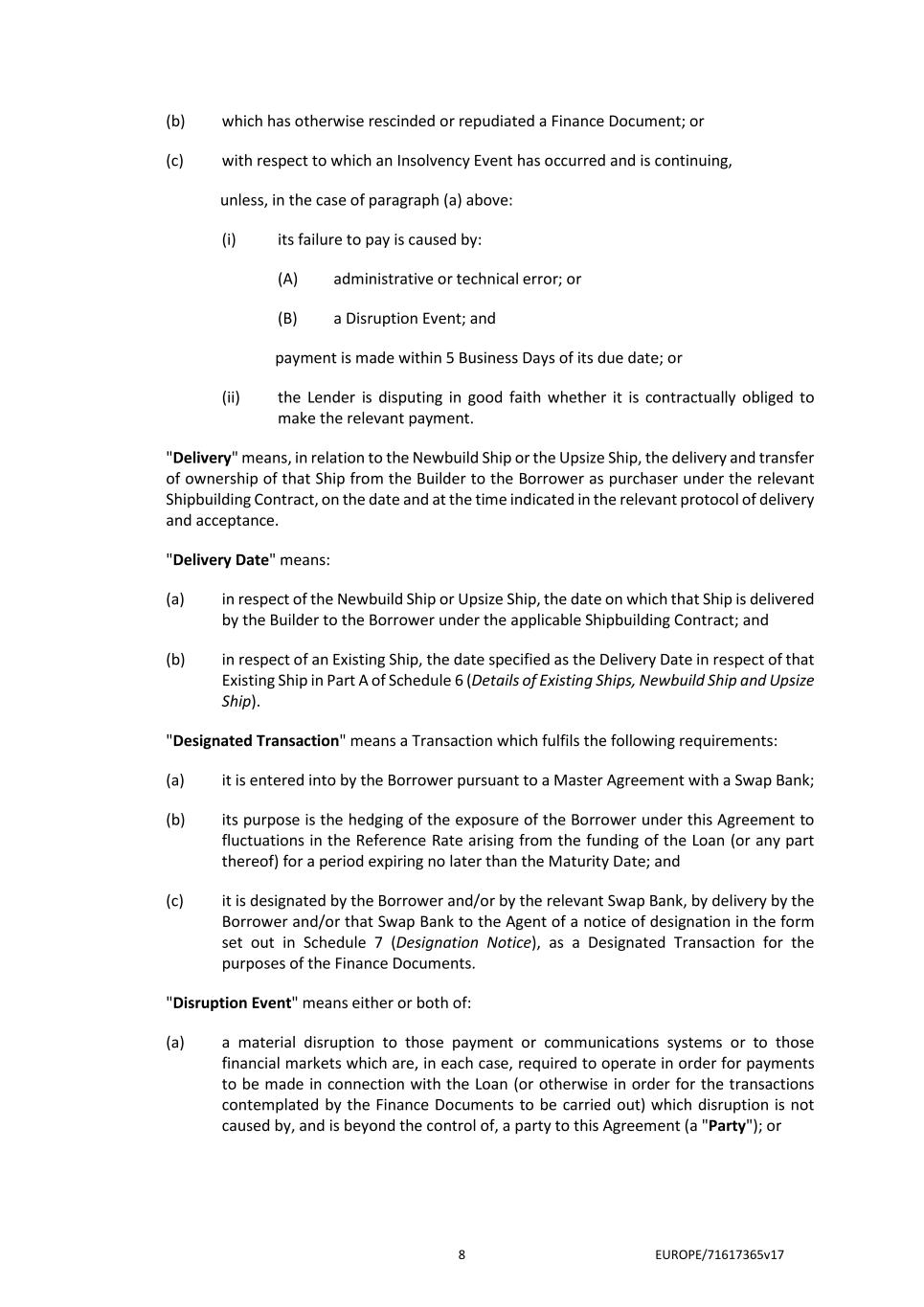 8 EUROPE/71617365v17 (b) which has otherwise rescinded or repudiated a Finance Document; or (c) with respect to which an Insolvency Event has occurred and is continuing, unless, in the case of paragraph (a) above: (i) its failure to pay is caused by: (A) administrative or technical error; or (B) a Disruption Event; and payment is made within 5 Business Days of its due date; or (ii) the Lender is disputing in good faith whether it is contractually obliged to make the relevant payment. "Delivery" means, in relation to the Newbuild Ship or the Upsize Ship, the delivery and transfer of ownership of that Ship from the Builder to the Borrower as purchaser under the relevant Shipbuilding Contract, on the date and at the time indicated in the relevant protocol of delivery and acceptance. "Delivery Date" means: (a) in respect of the Newbuild Ship or Upsize Ship, the date on which that Ship is delivered by the Builder to the Borrower under the applicable Shipbuilding Contract; and (b) in respect of an Existing Ship, the date specified as the Delivery Date in respect of that Existing Ship in Part A of Schedule 6 (Details of Existing Ships, Newbuild Ship and Upsize Ship). "Designated Transaction" means a Transaction which fulfils the following requirements: (a) it is entered into by the Borrower pursuant to a Master Agreement with a Swap Bank; (b) its purpose is the hedging of the exposure of the Borrower under this Agreement to fluctuations in the Reference Rate arising from the funding of the Loan (or any part thereof) for a period expiring no later than the Maturity Date; and (c) it is designated by the Borrower and/or by the relevant Swap Bank, by delivery by the Borrower and/or that Swap Bank to the Agent of a notice of designation in the form set out in Schedule 7 (Designation Notice), as a Designated Transaction for the purposes of the Finance Documents. "Disruption Event" means either or both of: (a) a material disruption to those payment or communications systems or to those financial markets which are, in each case, required to operate in order for payments to be made in connection with the Loan (or otherwise in order for the transactions contemplated by the Finance Documents to be carried out) which disruption is not caused by, and is beyond the control of, a party to this Agreement (a "Party"); or