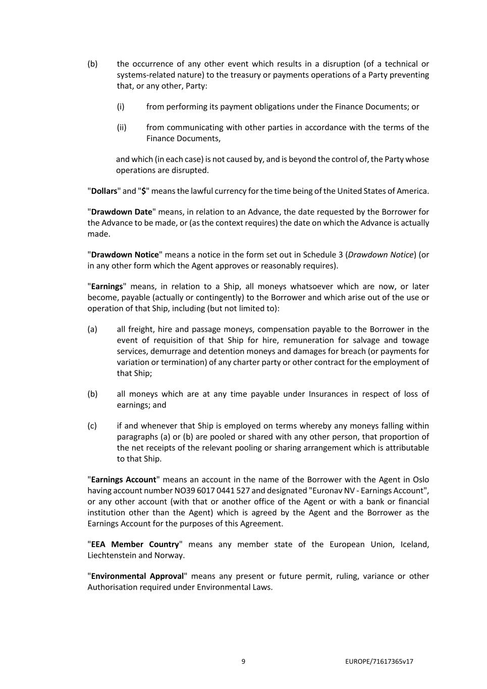 9 EUROPE/71617365v17 (b) the occurrence of any other event which results in a disruption (of a technical or systems-related nature) to the treasury or payments operations of a Party preventing that, or any other, Party: (i) from performing its payment obligations under the Finance Documents; or (ii) from communicating with other parties in accordance with the terms of the Finance Documents, and which (in each case) is not caused by, and is beyond the control of, the Party whose operations are disrupted. "Dollars" and "$" means the lawful currency for the time being of the United States of America. "Drawdown Date" means, in relation to an Advance, the date requested by the Borrower for the Advance to be made, or (as the context requires) the date on which the Advance is actually made. "Drawdown Notice" means a notice in the form set out in Schedule 3 (Drawdown Notice) (or in any other form which the Agent approves or reasonably requires). "Earnings" means, in relation to a Ship, all moneys whatsoever which are now, or later become, payable (actually or contingently) to the Borrower and which arise out of the use or operation of that Ship, including (but not limited to): (a) all freight, hire and passage moneys, compensation payable to the Borrower in the event of requisition of that Ship for hire, remuneration for salvage and towage services, demurrage and detention moneys and damages for breach (or payments for variation or termination) of any charter party or other contract for the employment of that Ship; (b) all moneys which are at any time payable under Insurances in respect of loss of earnings; and (c) if and whenever that Ship is employed on terms whereby any moneys falling within paragraphs (a) or (b) are pooled or shared with any other person, that proportion of the net receipts of the relevant pooling or sharing arrangement which is attributable to that Ship. "Earnings Account" means an account in the name of the Borrower with the Agent in Oslo having account number NO39 6017 0441 527 and designated "Euronav NV - Earnings Account", or any other account (with that or another office of the Agent or with a bank or financial institution other than the Agent) which is agreed by the Agent and the Borrower as the Earnings Account for the purposes of this Agreement. "EEA Member Country" means any member state of the European Union, Iceland, Liechtenstein and Norway. "Environmental Approval" means any present or future permit, ruling, variance or other Authorisation required under Environmental Laws.