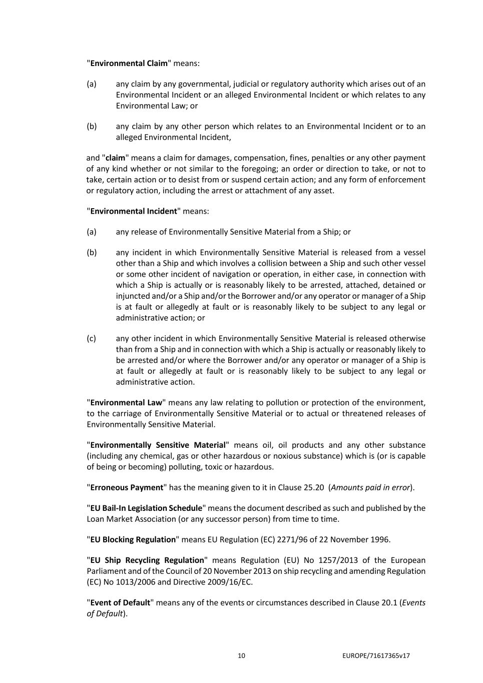 10 EUROPE/71617365v17 "Environmental Claim" means: (a) any claim by any governmental, judicial or regulatory authority which arises out of an Environmental Incident or an alleged Environmental Incident or which relates to any Environmental Law; or (b) any claim by any other person which relates to an Environmental Incident or to an alleged Environmental Incident, and "claim" means a claim for damages, compensation, fines, penalties or any other payment of any kind whether or not similar to the foregoing; an order or direction to take, or not to take, certain action or to desist from or suspend certain action; and any form of enforcement or regulatory action, including the arrest or attachment of any asset. "Environmental Incident" means: (a) any release of Environmentally Sensitive Material from a Ship; or (b) any incident in which Environmentally Sensitive Material is released from a vessel other than a Ship and which involves a collision between a Ship and such other vessel or some other incident of navigation or operation, in either case, in connection with which a Ship is actually or is reasonably likely to be arrested, attached, detained or injuncted and/or a Ship and/or the Borrower and/or any operator or manager of a Ship is at fault or allegedly at fault or is reasonably likely to be subject to any legal or administrative action; or (c) any other incident in which Environmentally Sensitive Material is released otherwise than from a Ship and in connection with which a Ship is actually or reasonably likely to be arrested and/or where the Borrower and/or any operator or manager of a Ship is at fault or allegedly at fault or is reasonably likely to be subject to any legal or administrative action. "Environmental Law" means any law relating to pollution or protection of the environment, to the carriage of Environmentally Sensitive Material or to actual or threatened releases of Environmentally Sensitive Material. "Environmentally Sensitive Material" means oil, oil products and any other substance (including any chemical, gas or other hazardous or noxious substance) which is (or is capable of being or becoming) polluting, toxic or hazardous. "Erroneous Payment" has the meaning given to it in Clause 25.20 (Amounts paid in error). "EU Bail-In Legislation Schedule" means the document described as such and published by the Loan Market Association (or any successor person) from time to time. "EU Blocking Regulation" means EU Regulation (EC) 2271/96 of 22 November 1996. "EU Ship Recycling Regulation" means Regulation (EU) No 1257/2013 of the European Parliament and of the Council of 20 November 2013 on ship recycling and amending Regulation (EC) No 1013/2006 and Directive 2009/16/EC. "Event of Default" means any of the events or circumstances described in Clause 20.1 (Events of Default).
