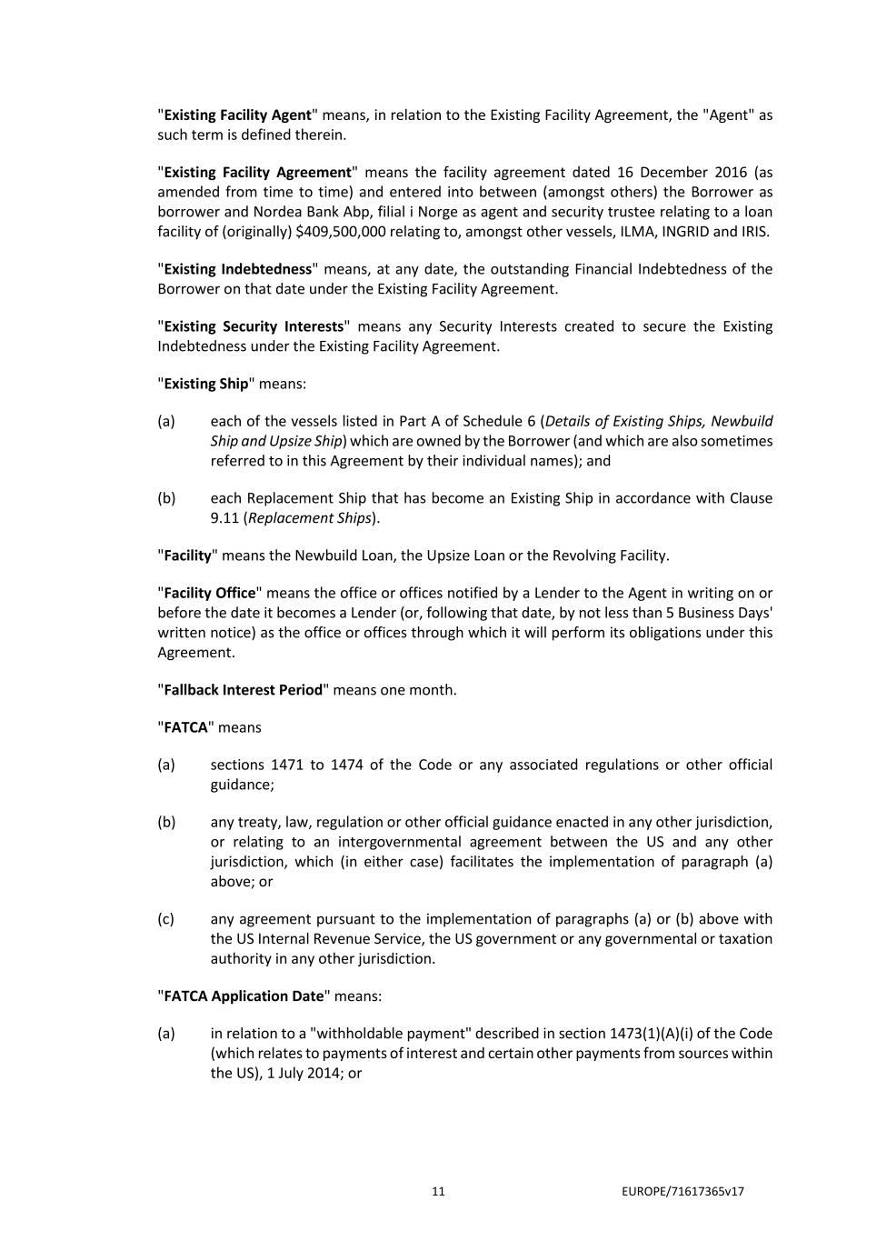 11 EUROPE/71617365v17 "Existing Facility Agent" means, in relation to the Existing Facility Agreement, the "Agent" as such term is defined therein. "Existing Facility Agreement" means the facility agreement dated 16 December 2016 (as amended from time to time) and entered into between (amongst others) the Borrower as borrower and Nordea Bank Abp, filial i Norge as agent and security trustee relating to a loan facility of (originally) $409,500,000 relating to, amongst other vessels, ILMA, INGRID and IRIS. "Existing Indebtedness" means, at any date, the outstanding Financial Indebtedness of the Borrower on that date under the Existing Facility Agreement. "Existing Security Interests" means any Security Interests created to secure the Existing Indebtedness under the Existing Facility Agreement. "Existing Ship" means: (a) each of the vessels listed in Part A of Schedule 6 (Details of Existing Ships, Newbuild Ship and Upsize Ship) which are owned by the Borrower (and which are also sometimes referred to in this Agreement by their individual names); and (b) each Replacement Ship that has become an Existing Ship in accordance with Clause 9.11 (Replacement Ships). "Facility" means the Newbuild Loan, the Upsize Loan or the Revolving Facility. "Facility Office" means the office or offices notified by a Lender to the Agent in writing on or before the date it becomes a Lender (or, following that date, by not less than 5 Business Days' written notice) as the office or offices through which it will perform its obligations under this Agreement. "Fallback Interest Period" means one month. "FATCA" means (a) sections 1471 to 1474 of the Code or any associated regulations or other official guidance; (b) any treaty, law, regulation or other official guidance enacted in any other jurisdiction, or relating to an intergovernmental agreement between the US and any other jurisdiction, which (in either case) facilitates the implementation of paragraph (a) above; or (c) any agreement pursuant to the implementation of paragraphs (a) or (b) above with the US Internal Revenue Service, the US government or any governmental or taxation authority in any other jurisdiction. "FATCA Application Date" means: (a) in relation to a "withholdable payment" described in section 1473(1)(A)(i) of the Code (which relates to payments of interest and certain other payments from sources within the US), 1 July 2014; or