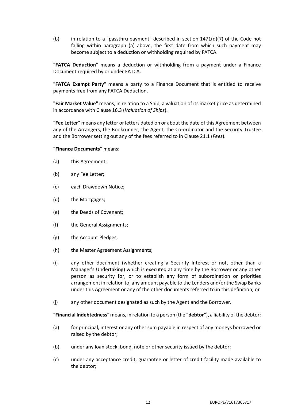 12 EUROPE/71617365v17 (b) in relation to a "passthru payment" described in section 1471(d)(7) of the Code not falling within paragraph (a) above, the first date from which such payment may become subject to a deduction or withholding required by FATCA. "FATCA Deduction" means a deduction or withholding from a payment under a Finance Document required by or under FATCA. "FATCA Exempt Party" means a party to a Finance Document that is entitled to receive payments free from any FATCA Deduction. "Fair Market Value" means, in relation to a Ship, a valuation of its market price as determined in accordance with Clause 16.3 (Valuation of Ships). "Fee Letter" means any letter or letters dated on or about the date of this Agreement between any of the Arrangers, the Bookrunner, the Agent, the Co-ordinator and the Security Trustee and the Borrower setting out any of the fees referred to in Clause 21.1 (Fees). "Finance Documents" means: (a) this Agreement; (b) any Fee Letter; (c) each Drawdown Notice; (d) the Mortgages; (e) the Deeds of Covenant; (f) the General Assignments; (g) the Account Pledges; (h) the Master Agreement Assignments; (i) any other document (whether creating a Security Interest or not, other than a Manager's Undertaking) which is executed at any time by the Borrower or any other person as security for, or to establish any form of subordination or priorities arrangement in relation to, any amount payable to the Lenders and/or the Swap Banks under this Agreement or any of the other documents referred to in this definition; or (j) any other document designated as such by the Agent and the Borrower. "Financial Indebtedness" means, in relation to a person (the "debtor"), a liability of the debtor: (a) for principal, interest or any other sum payable in respect of any moneys borrowed or raised by the debtor; (b) under any loan stock, bond, note or other security issued by the debtor; (c) under any acceptance credit, guarantee or letter of credit facility made available to the debtor;