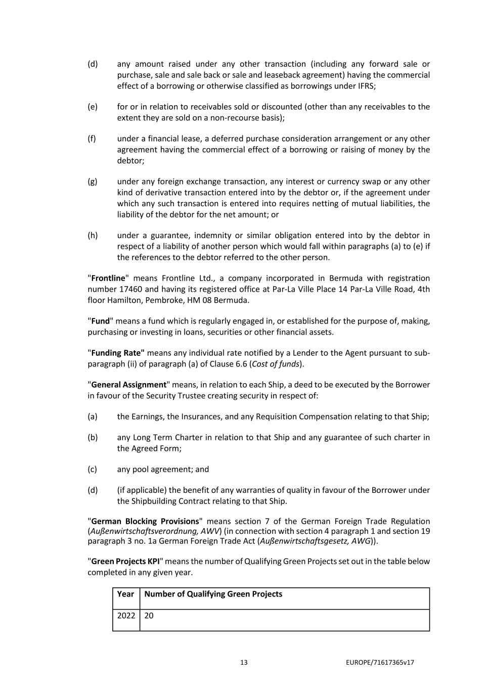 13 EUROPE/71617365v17 (d) any amount raised under any other transaction (including any forward sale or purchase, sale and sale back or sale and leaseback agreement) having the commercial effect of a borrowing or otherwise classified as borrowings under IFRS; (e) for or in relation to receivables sold or discounted (other than any receivables to the extent they are sold on a non-recourse basis); (f) under a financial lease, a deferred purchase consideration arrangement or any other agreement having the commercial effect of a borrowing or raising of money by the debtor; (g) under any foreign exchange transaction, any interest or currency swap or any other kind of derivative transaction entered into by the debtor or, if the agreement under which any such transaction is entered into requires netting of mutual liabilities, the liability of the debtor for the net amount; or (h) under a guarantee, indemnity or similar obligation entered into by the debtor in respect of a liability of another person which would fall within paragraphs (a) to (e) if the references to the debtor referred to the other person. "Frontline" means Frontline Ltd., a company incorporated in Bermuda with registration number 17460 and having its registered office at Par-La Ville Place 14 Par-La Ville Road, 4th floor Hamilton, Pembroke, HM 08 Bermuda. "Fund" means a fund which is regularly engaged in, or established for the purpose of, making, purchasing or investing in loans, securities or other financial assets. "Funding Rate" means any individual rate notified by a Lender to the Agent pursuant to sub- paragraph (ii) of paragraph (a) of Clause 6.6 (Cost of funds). "General Assignment" means, in relation to each Ship, a deed to be executed by the Borrower in favour of the Security Trustee creating security in respect of: (a) the Earnings, the Insurances, and any Requisition Compensation relating to that Ship; (b) any Long Term Charter in relation to that Ship and any guarantee of such charter in the Agreed Form; (c) any pool agreement; and (d) (if applicable) the benefit of any warranties of quality in favour of the Borrower under the Shipbuilding Contract relating to that Ship. "German Blocking Provisions" means section 7 of the German Foreign Trade Regulation (Außenwirtschaftsverordnung, AWV) (in connection with section 4 paragraph 1 and section 19 paragraph 3 no. 1a German Foreign Trade Act (Außenwirtschaftsgesetz, AWG)). "Green Projects KPI" means the number of Qualifying Green Projects set out in the table below completed in any given year. Year Number of Qualifying Green Projects 2022 20